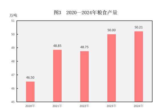 全年粮食总产量50.21万吨,比上年增加0.21万吨,增产0.42%。其中,夏粮产量0.51万吨,减产2.6%;早稻产量15.39万吨,减产0.05%;秋粮产量34.31万吨,增产0.8%。