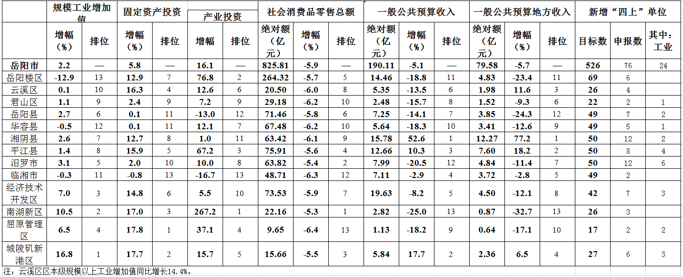 2020年1—7月岳阳市各县(市)区主要经济指标