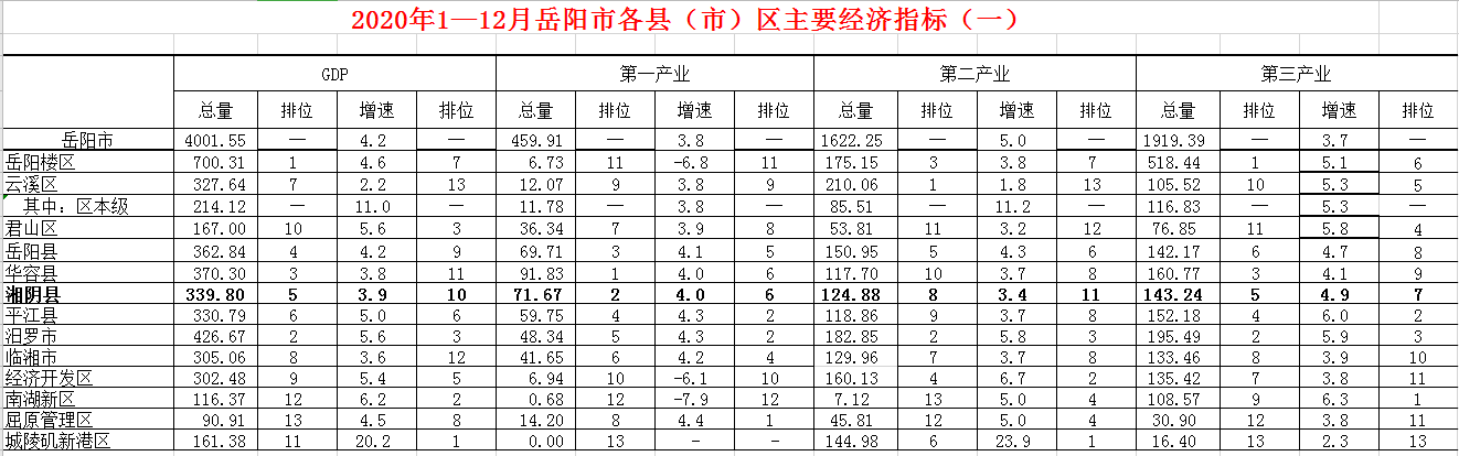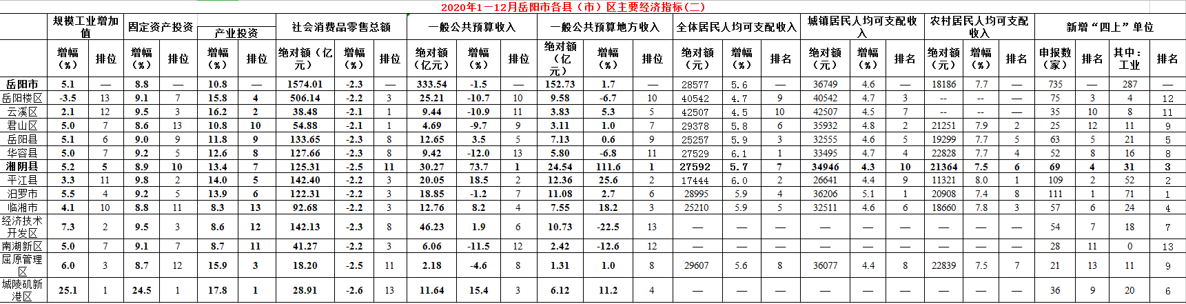 2020年1—12月岳阳市各县(市)区主要经济指标