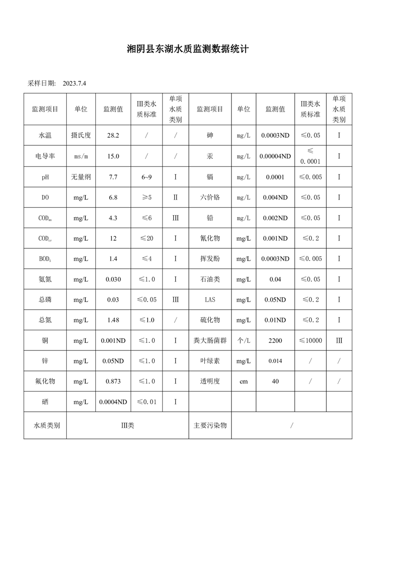 2023年7月份湘阴县水质监测点监测情况公示
