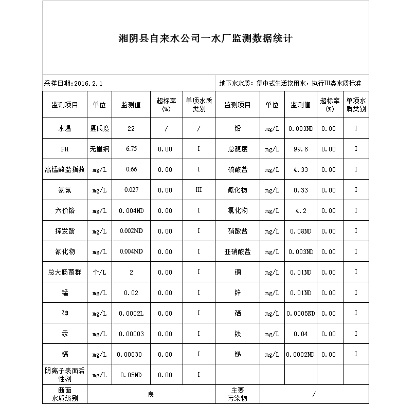 湘阴县自来水公司一水厂监测数据统计(2月)