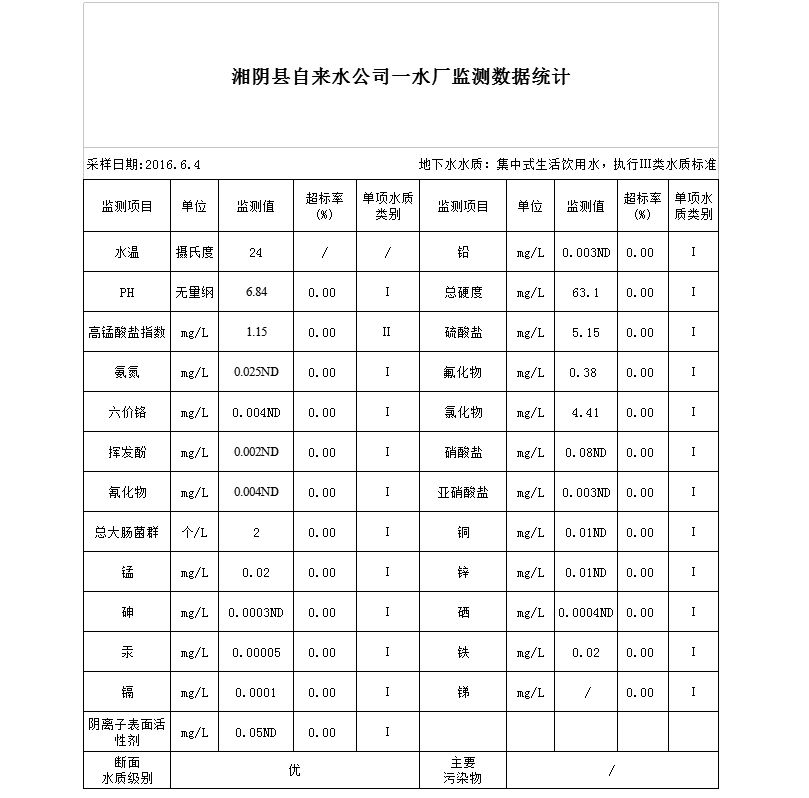 湘阴县自来水公司一水厂监测数据统计(6月)