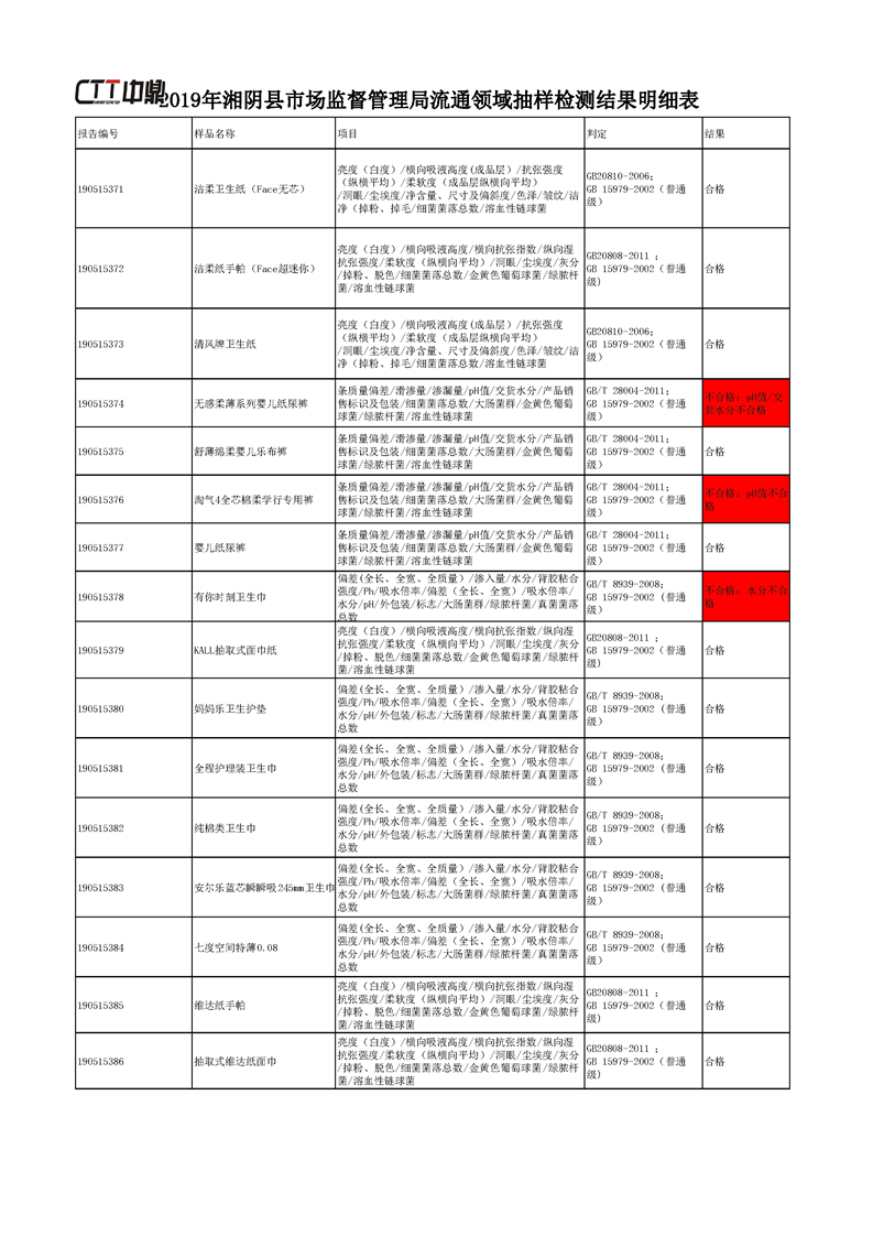 2019年湘阴县市场监督管理局流通领域抽样检测结果明细表