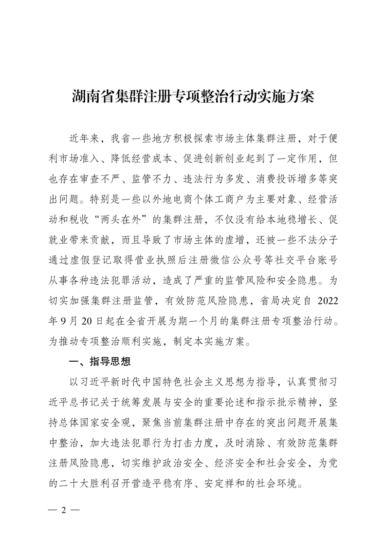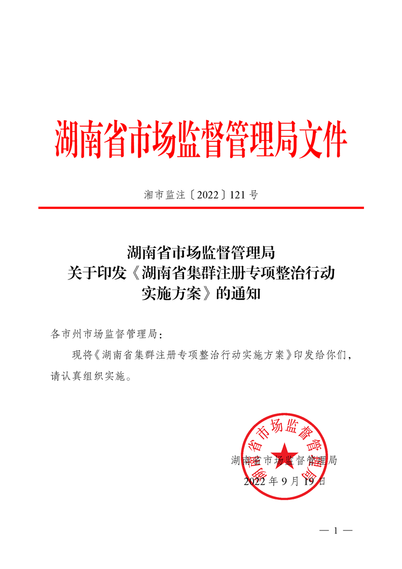 湖南省市场监督管理局关于印发《湖南省集群注册专项整治行动实施方案》的通知