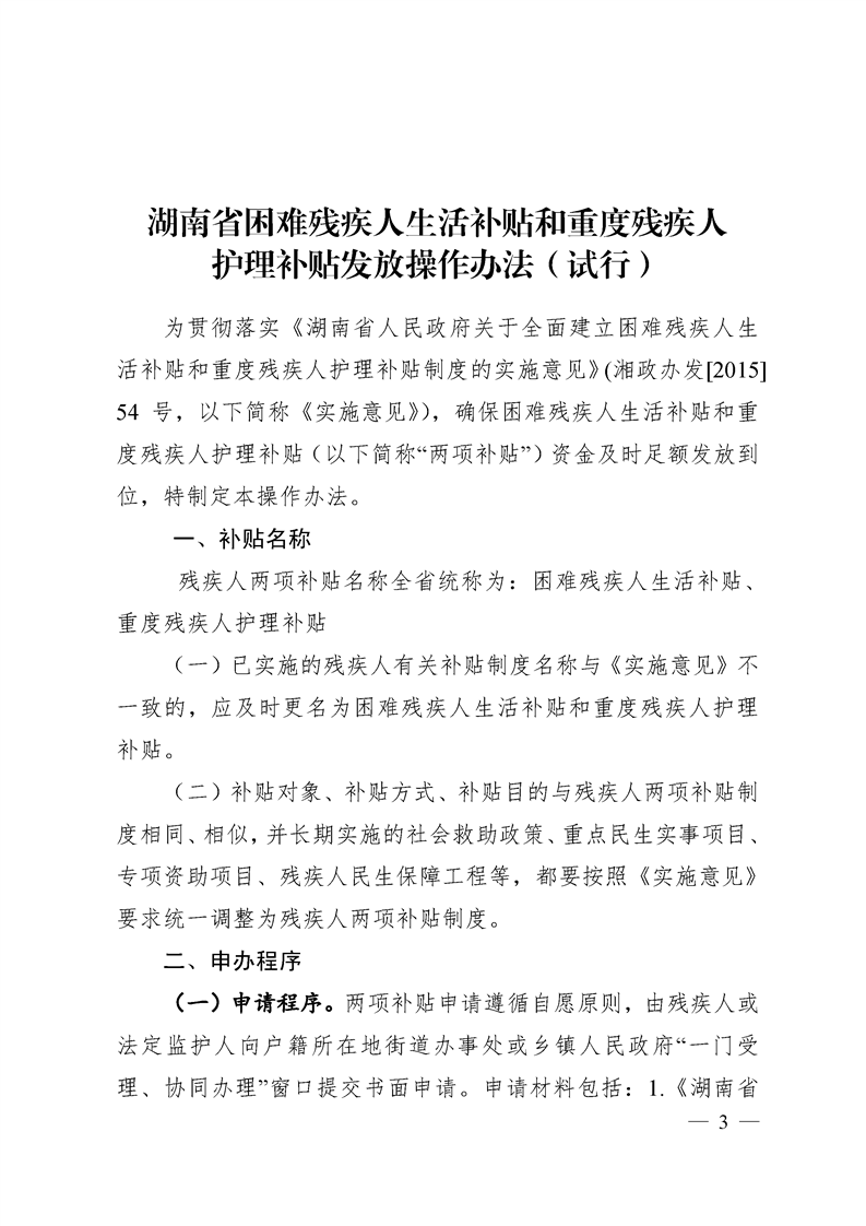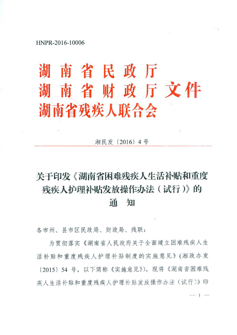 湘民发[2016]4号关于印发《湖南省困难残疾人生活补贴和重度残疾人护理补贴发放操作办法(试行)》的通知