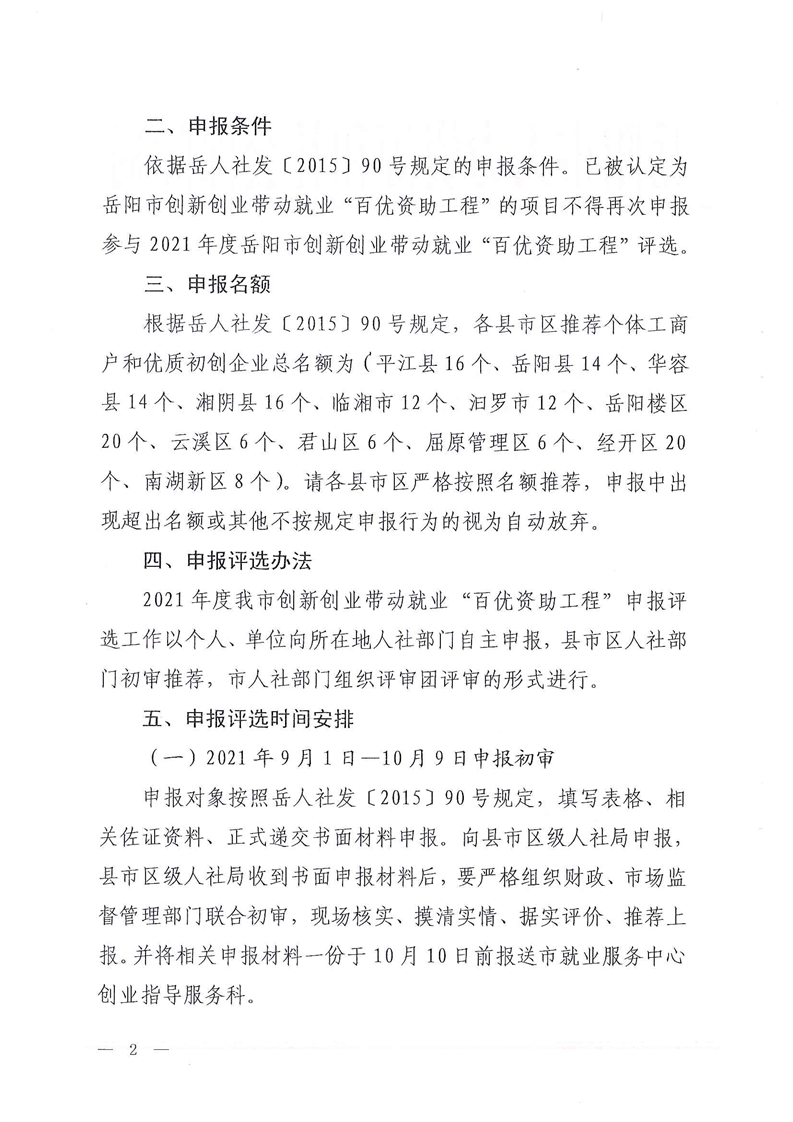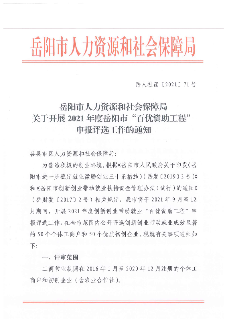 岳阳市人力资源和社会保障局关于开展2021年度岳阳市“百优资助工程”申报评选工作的通知