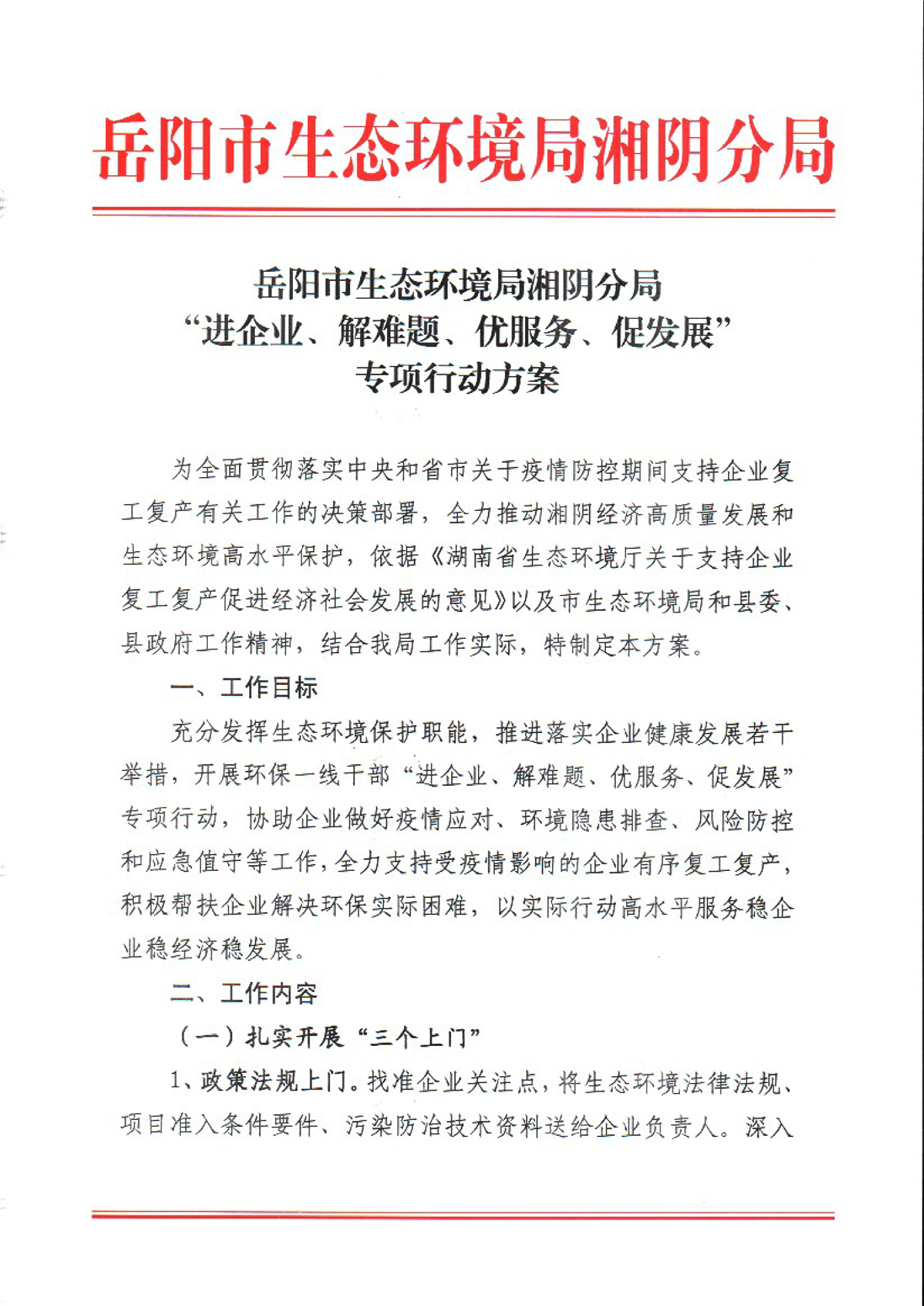 岳阳市生态环境局湘阴分局“进企业、解难题、优服务、促发展”专项行动方案