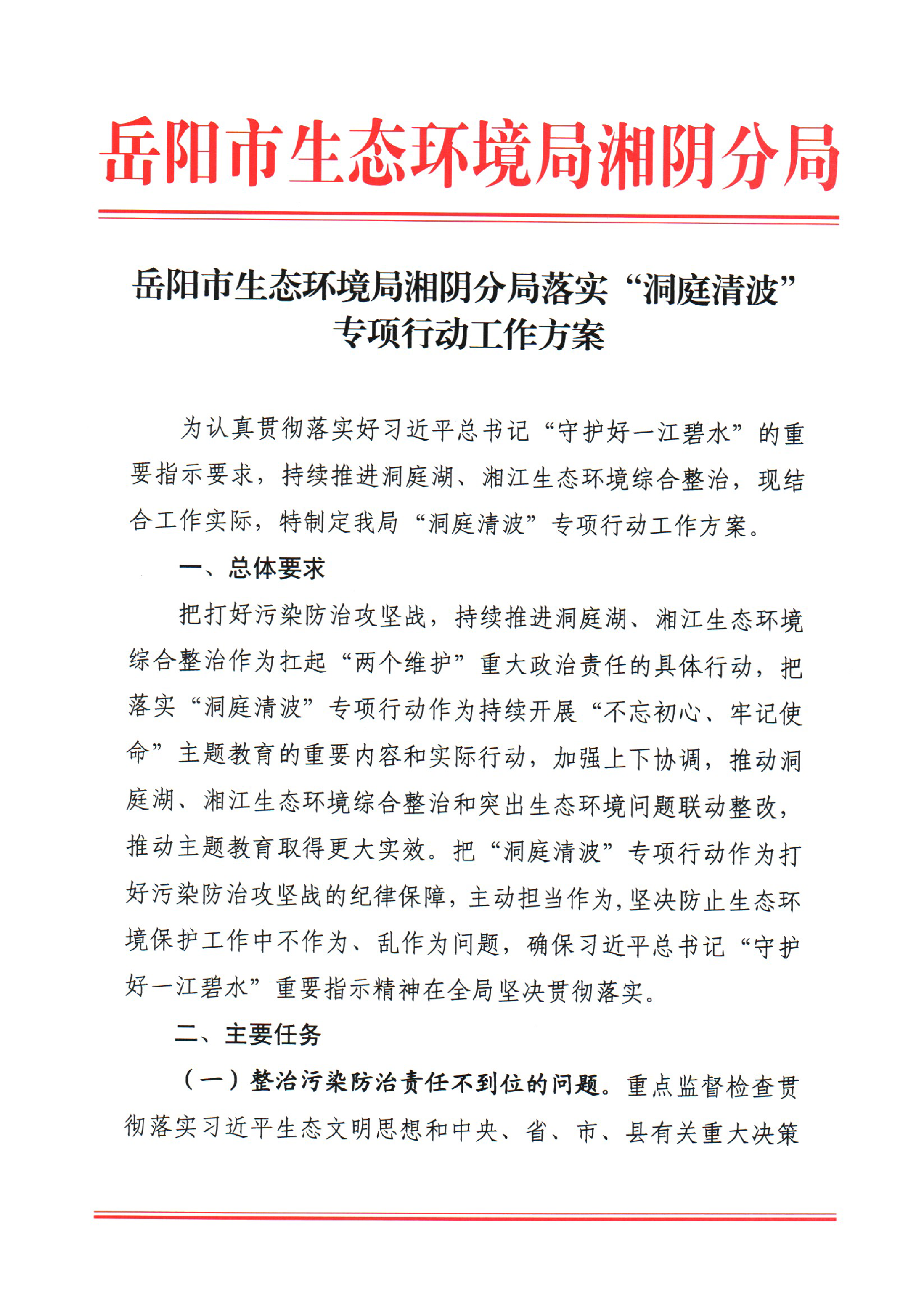 岳阳市生态环境局湘阴分局落实“洞庭清波”专项行动工作方案