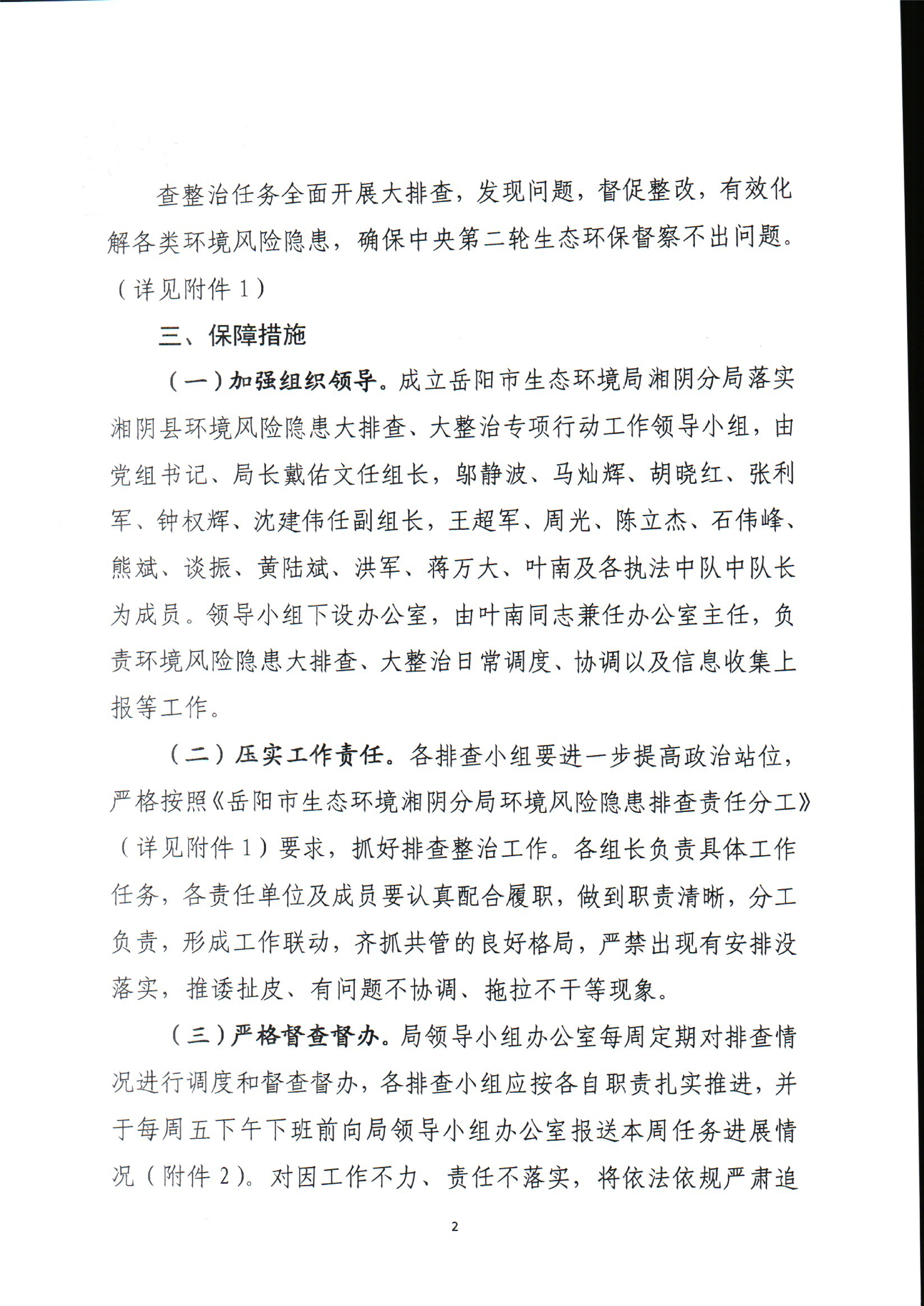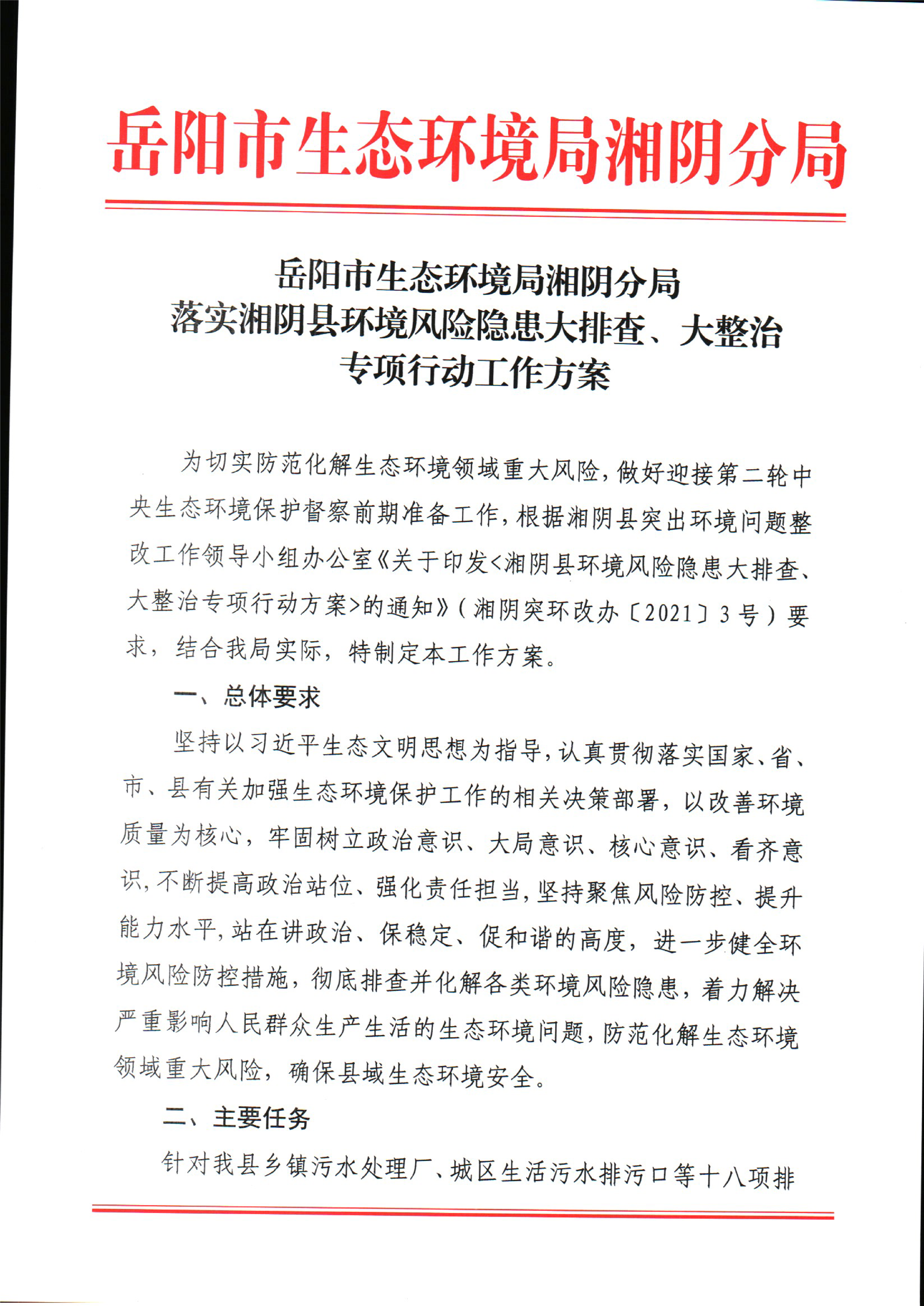 岳阳市生态环境局湘阴分局落实湘阴县环境风险隐患大排查、大整治专项行动工作方案