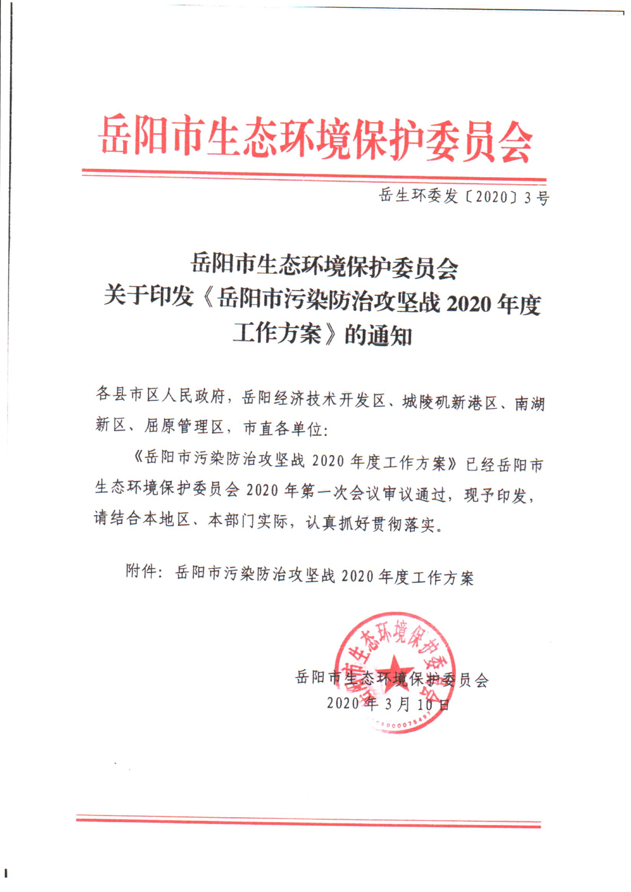 关于印发《岳阳市污染防治攻坚战2020年度工作方案》的通知