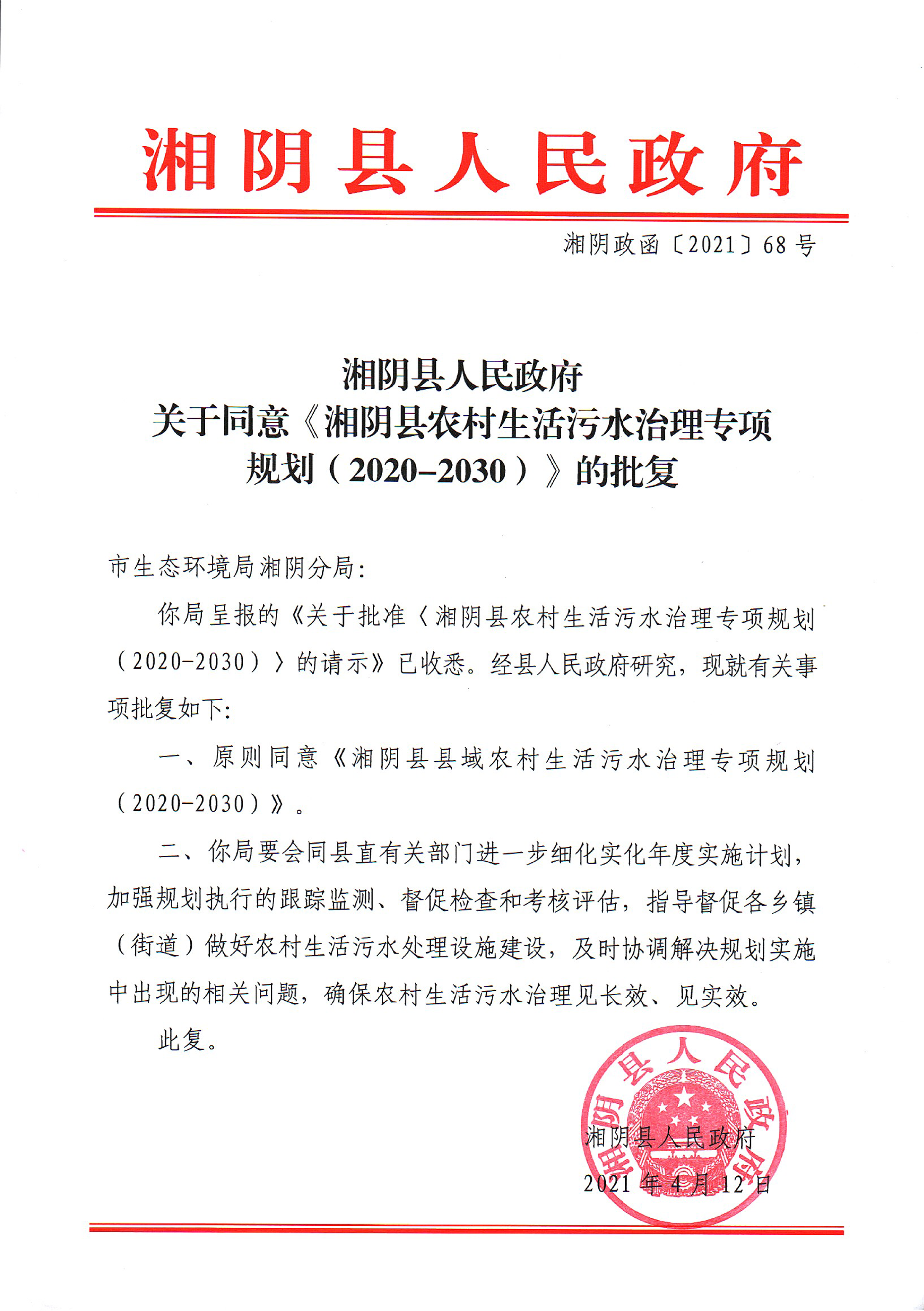 关于同意《湘阴农村生活污水治理专项规划(2020-2030)》的批复