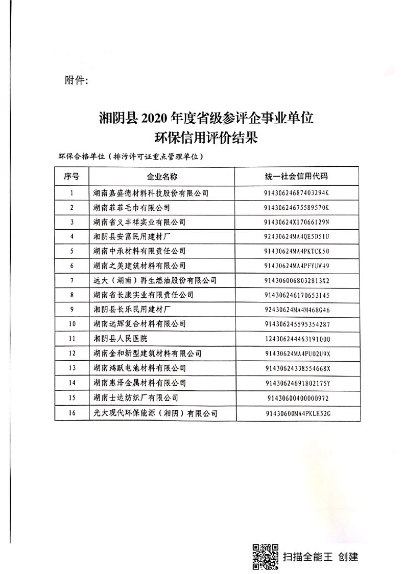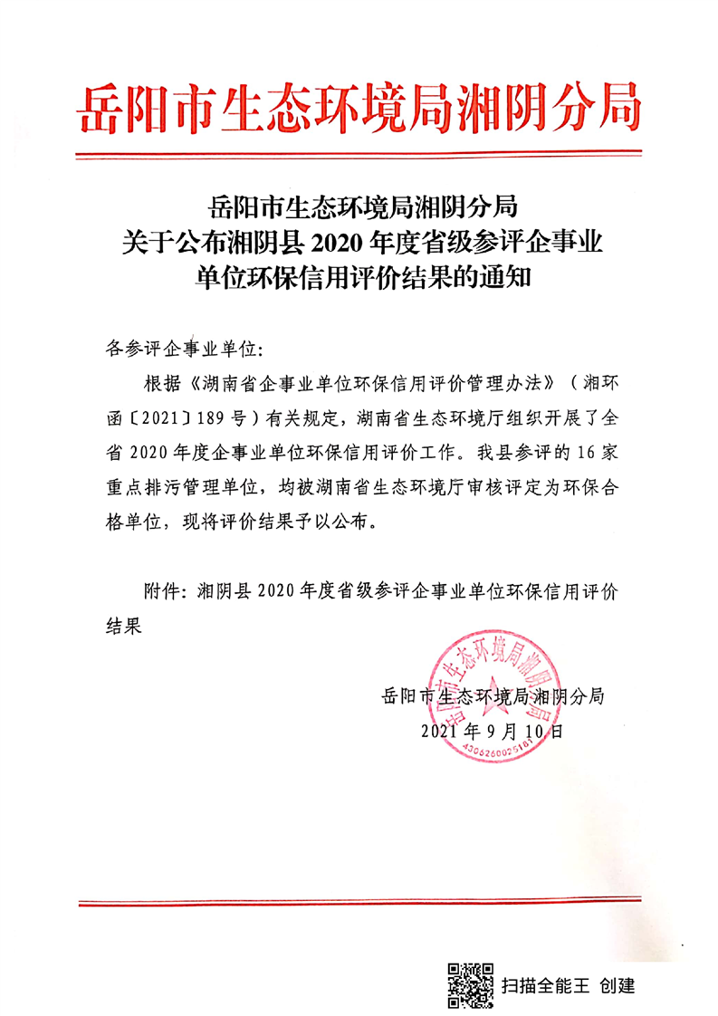 关于公布2020年度省级参评企事业单位环保信用评价结果的通知