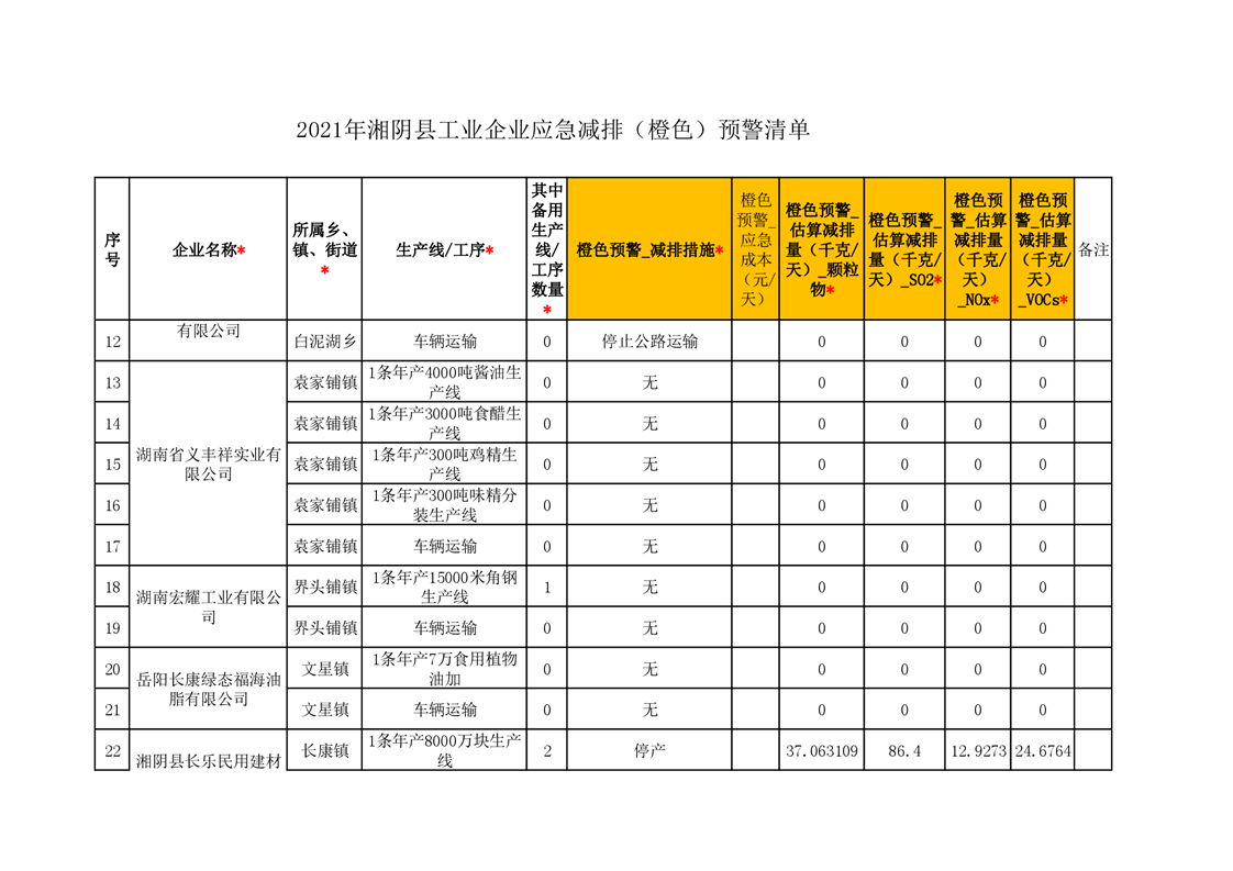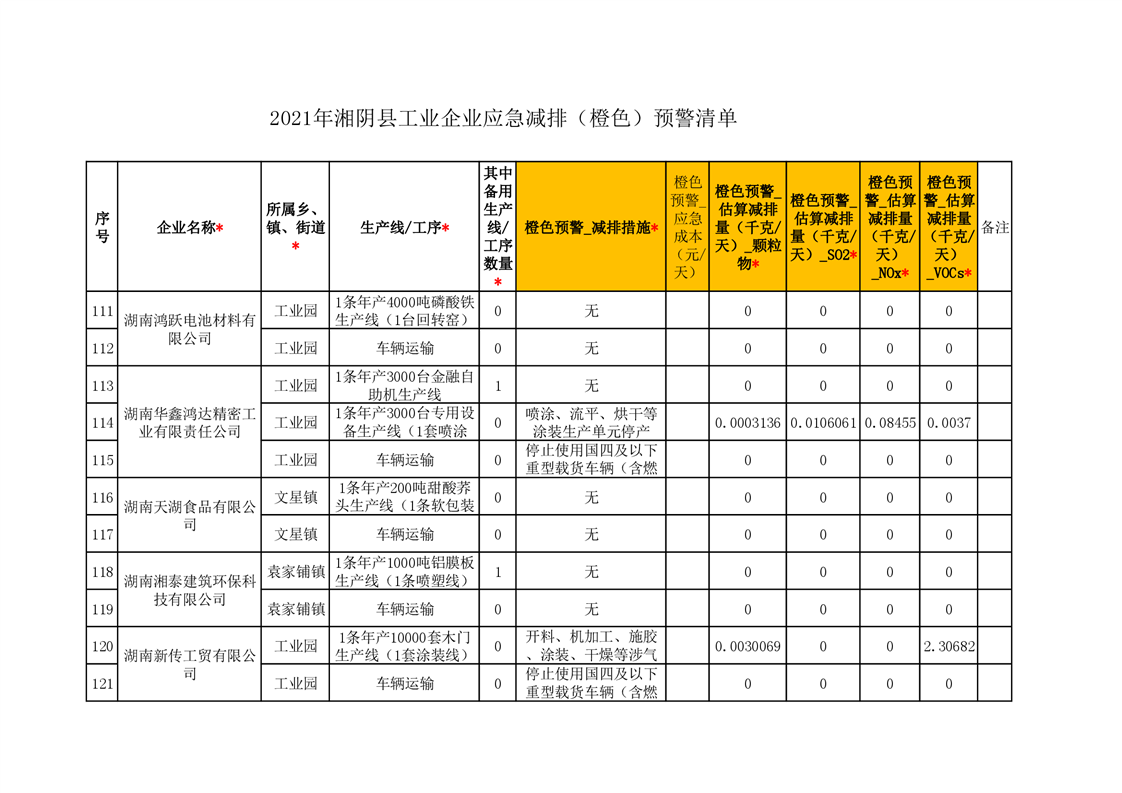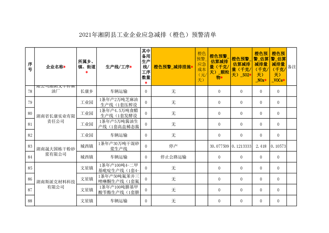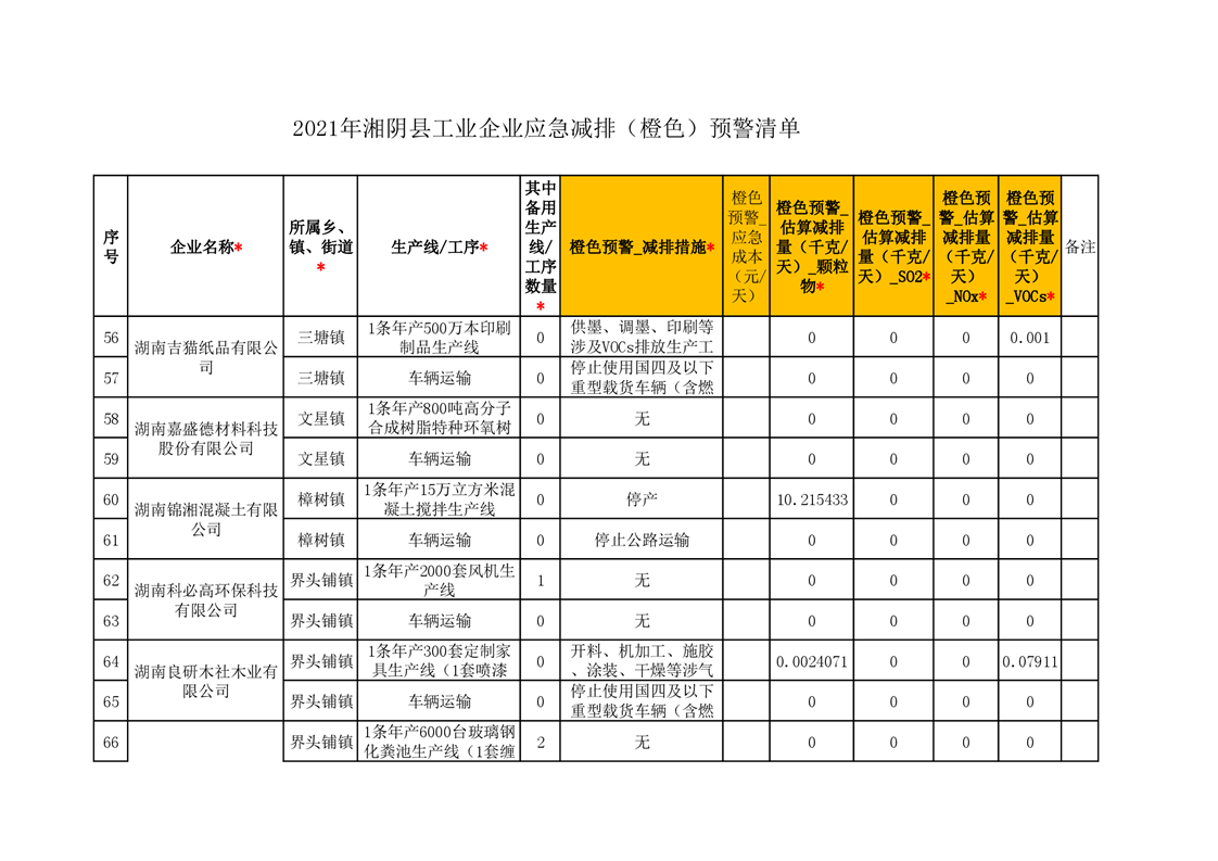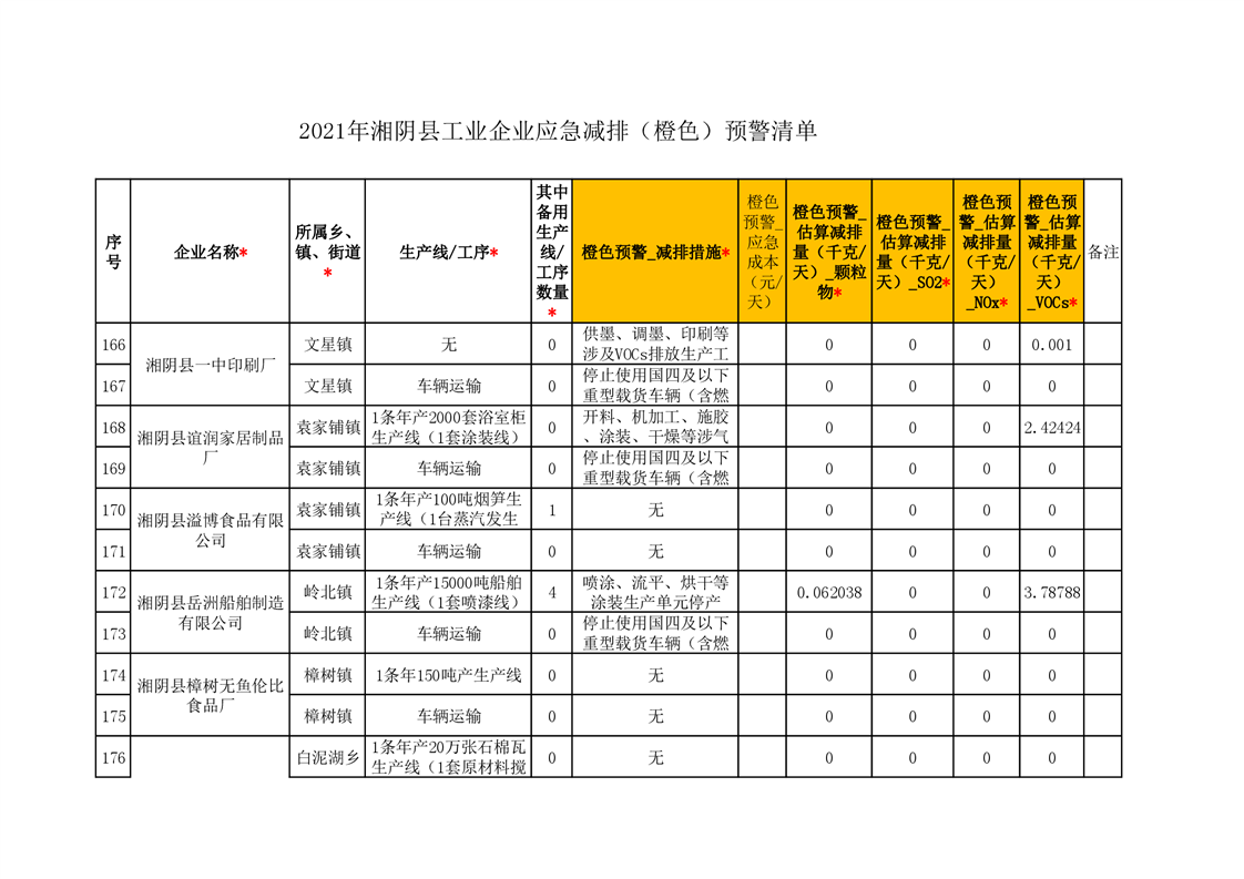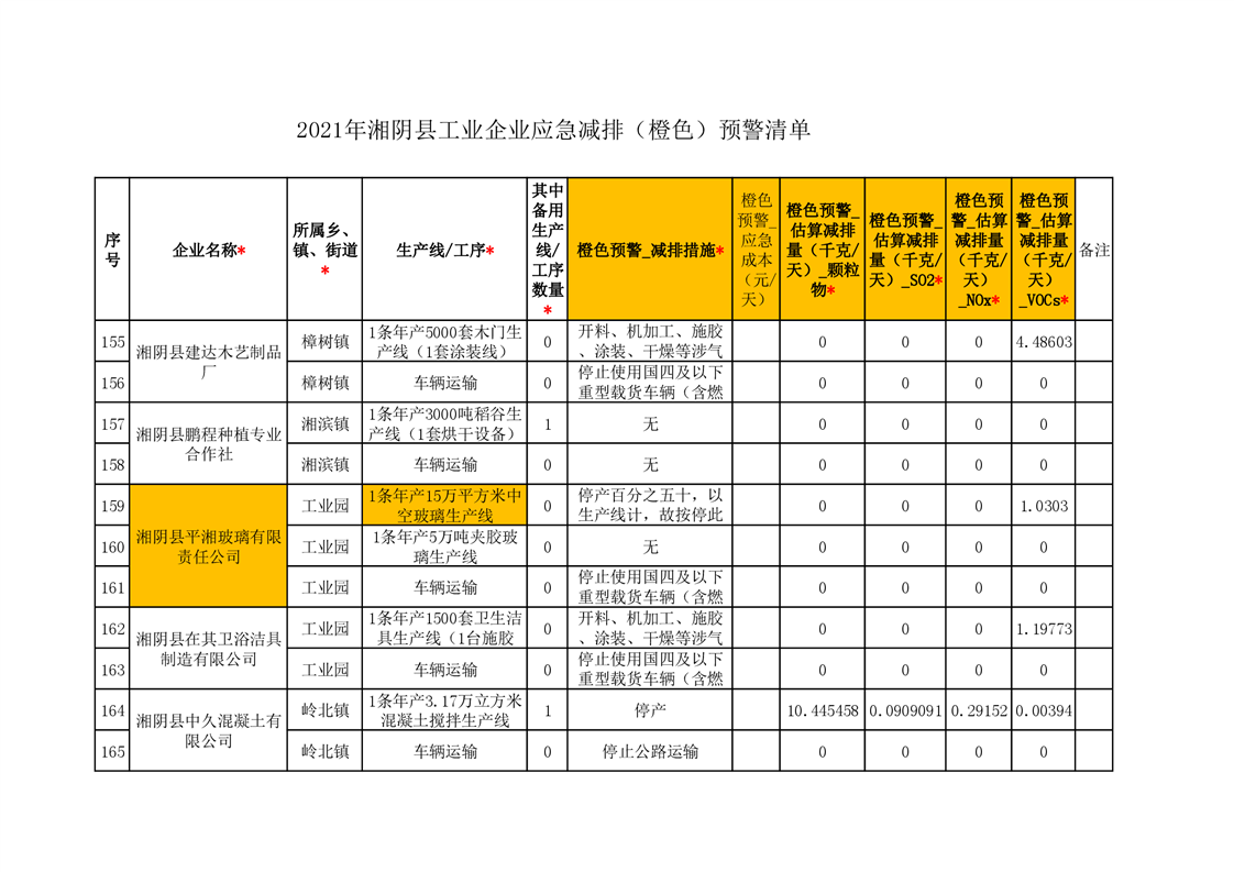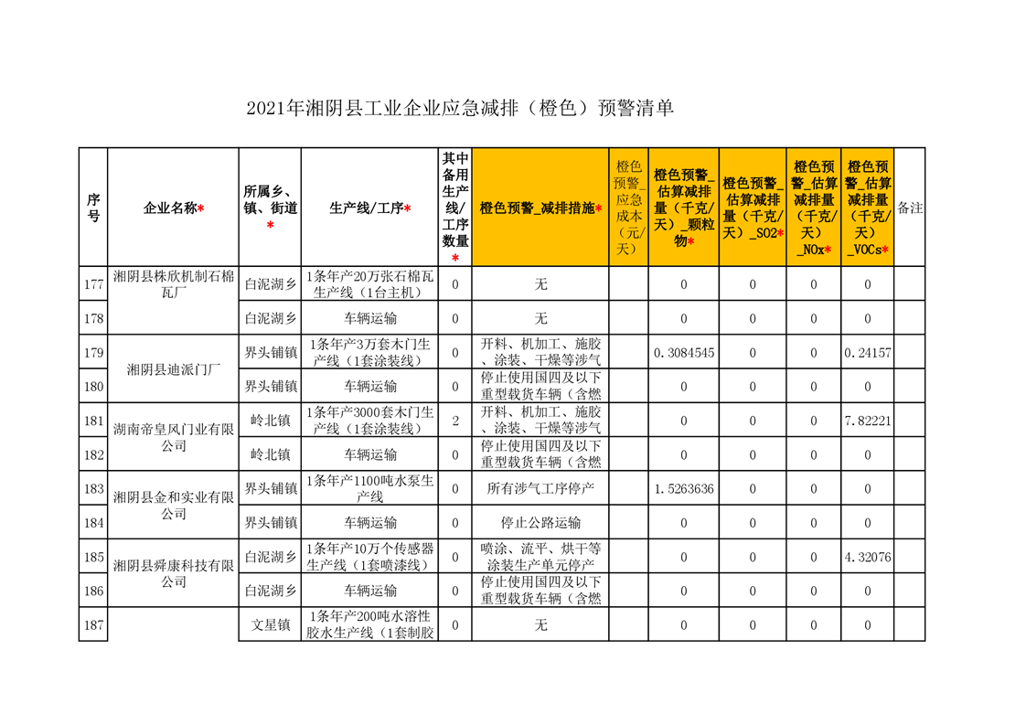 2021年湘阴县工业企业应急减排(橙色)预警清单