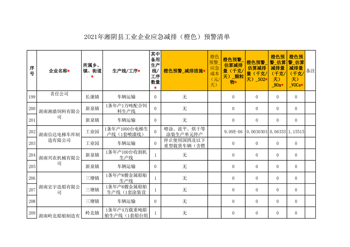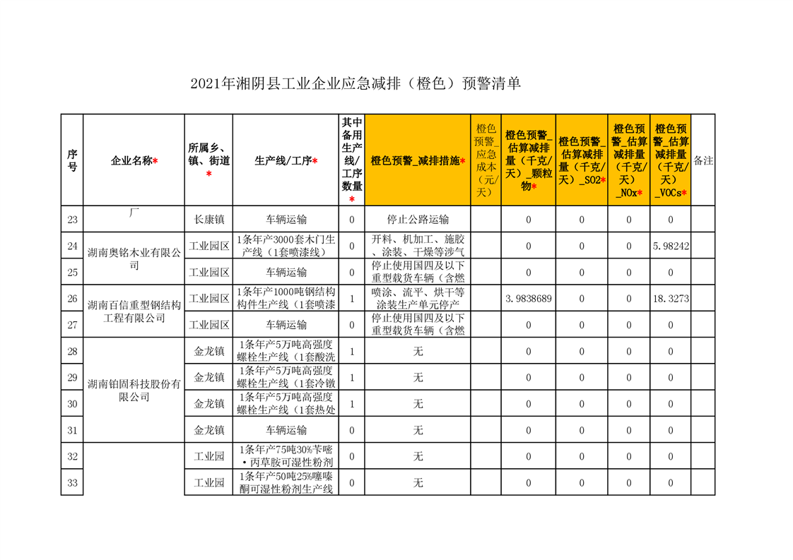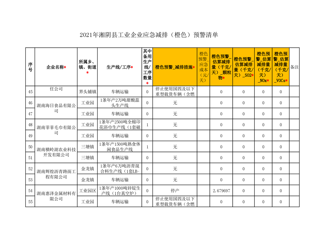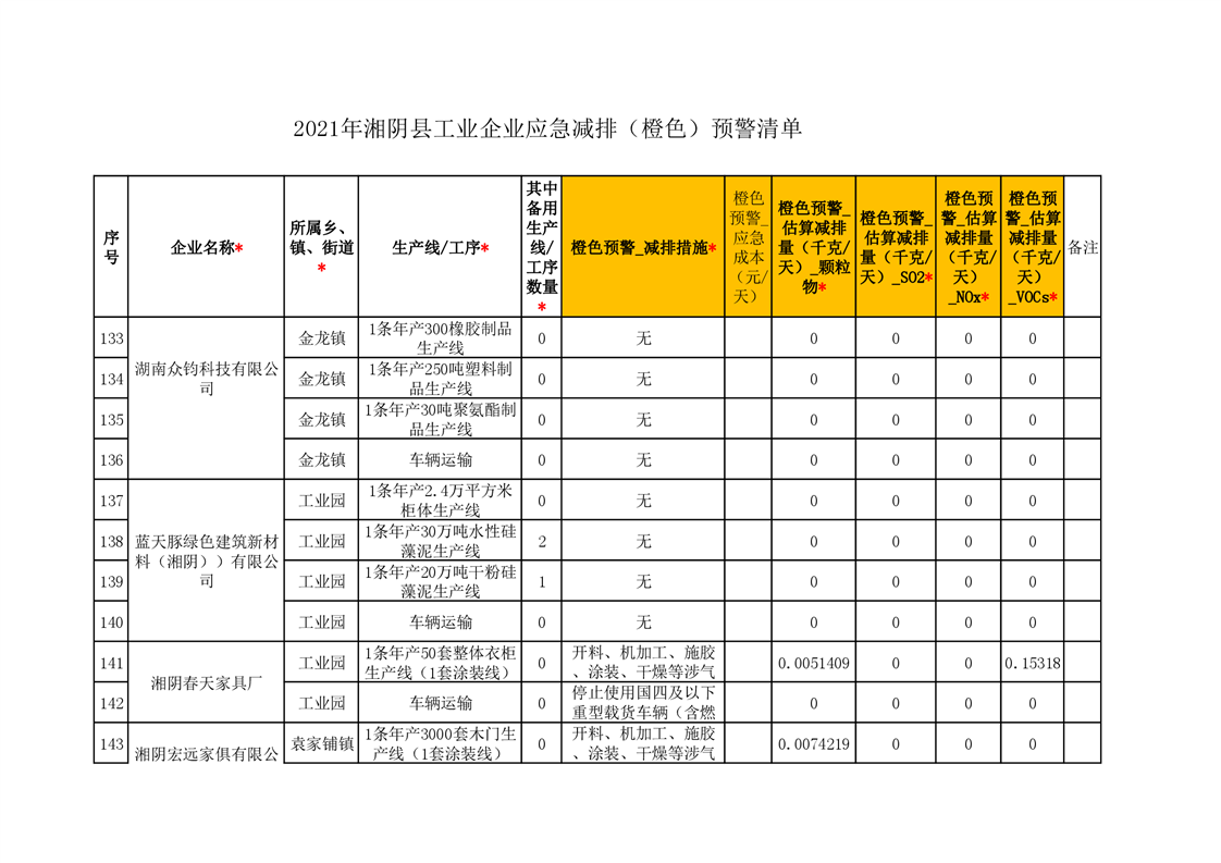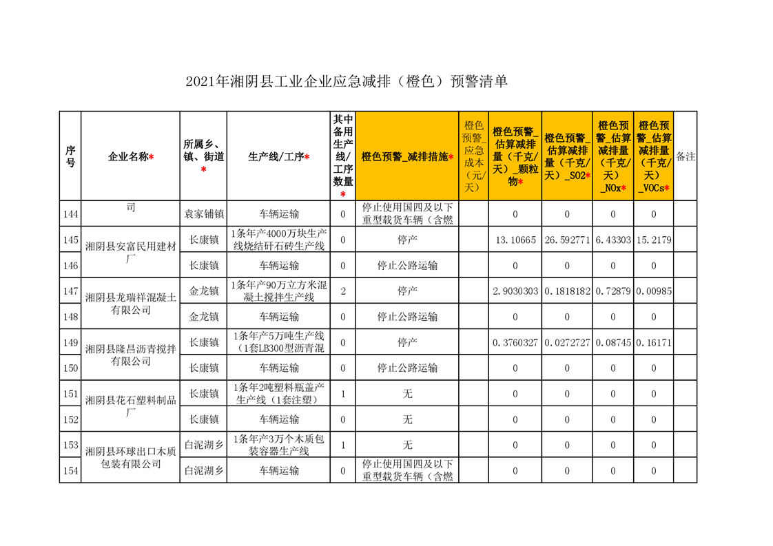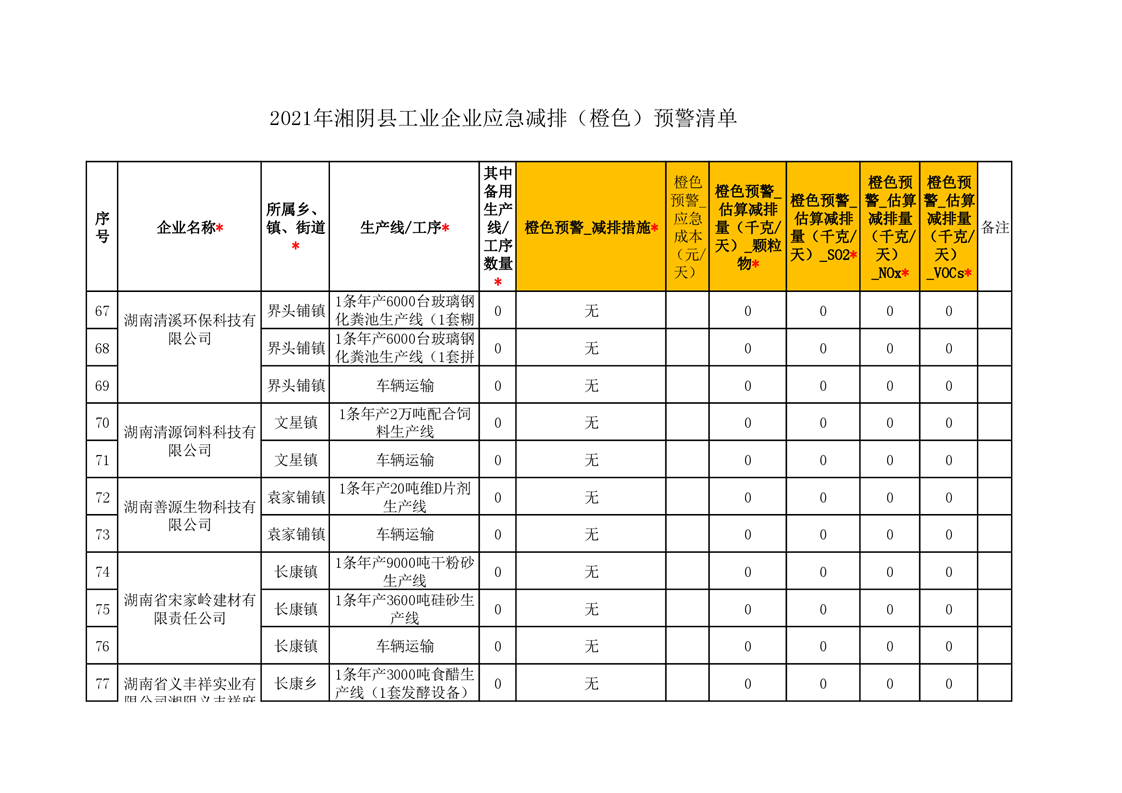 2021年湘阴县工业企业应急减排(橙色)预警清单