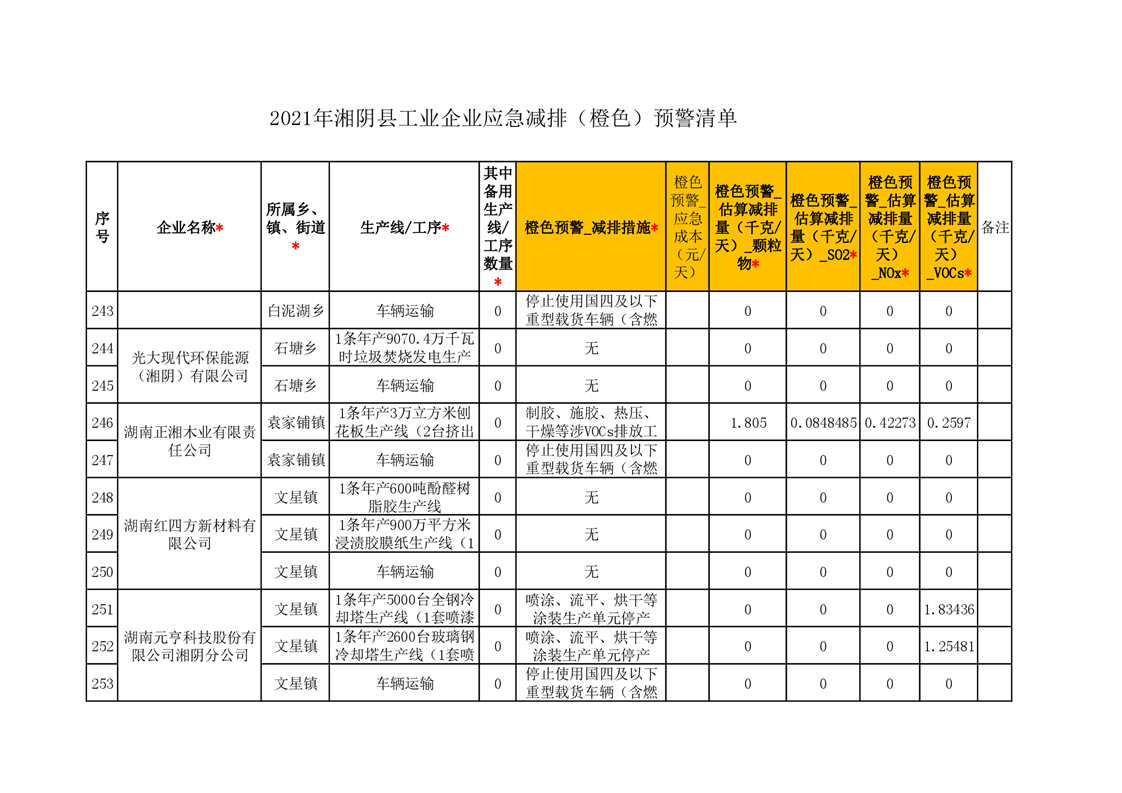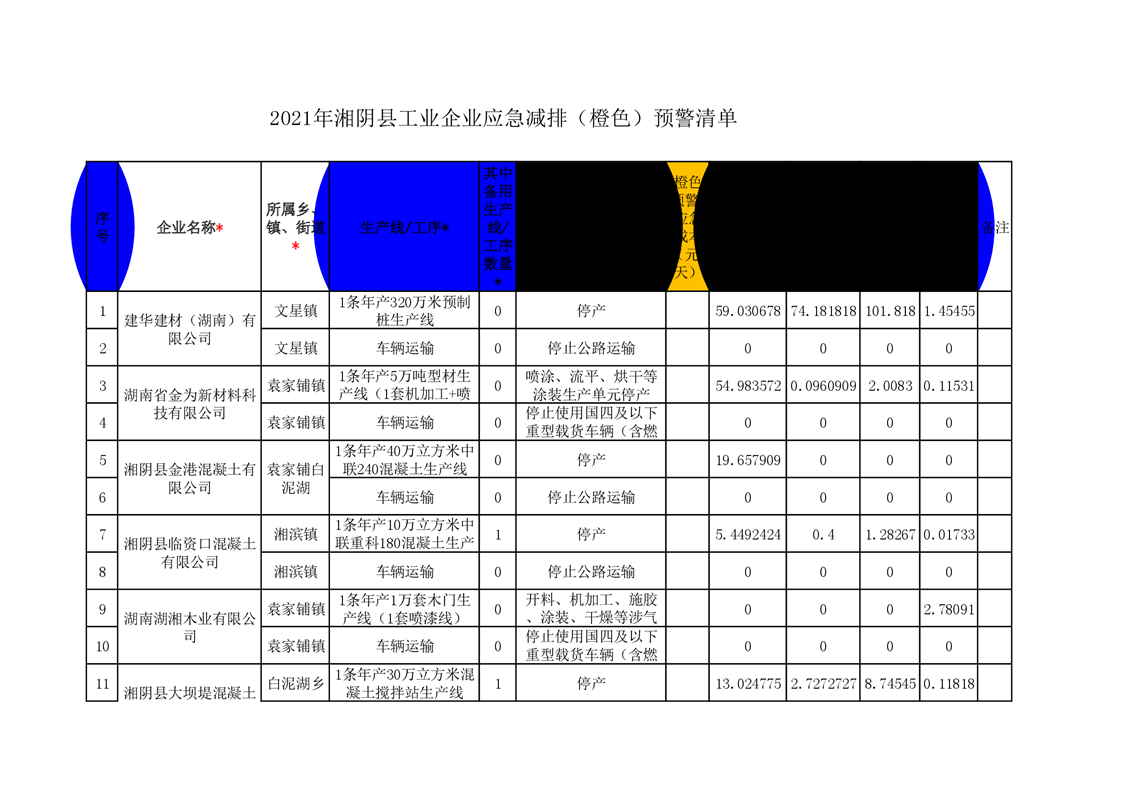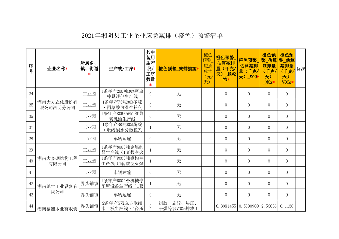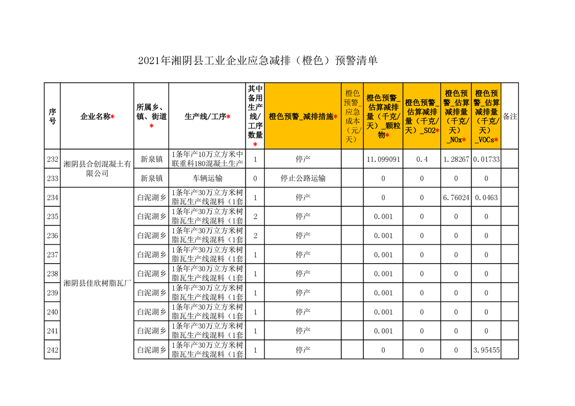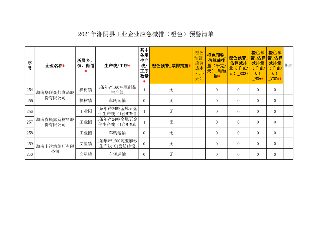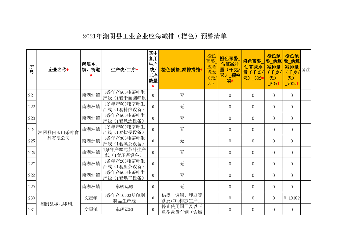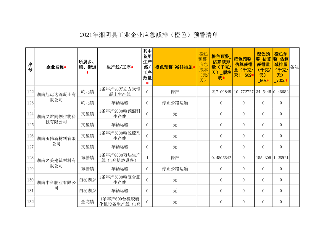 2021年湘阴县工业企业应急减排(橙色)预警清单