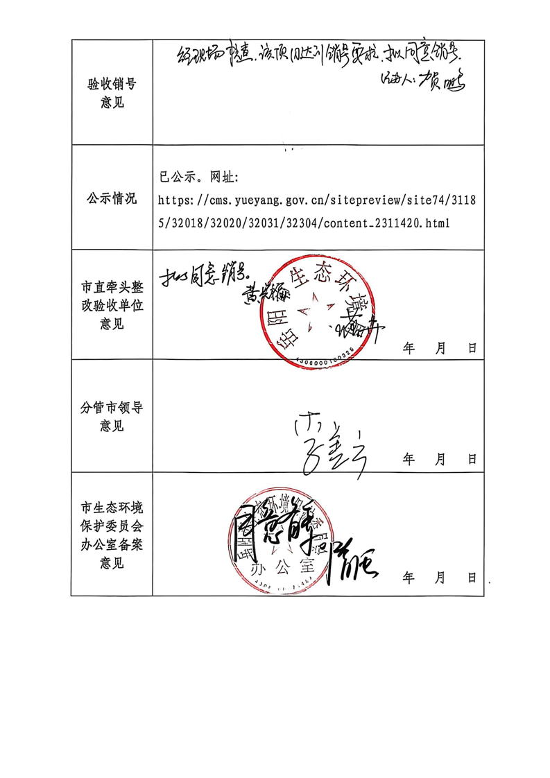 湘阴县第二轮中央生态环境保护督察反馈问题整改验收销号登记表
