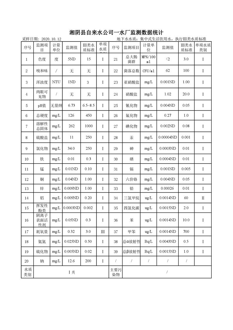 湘阴县自来水公司一水厂监测数据统计(2020年10月)