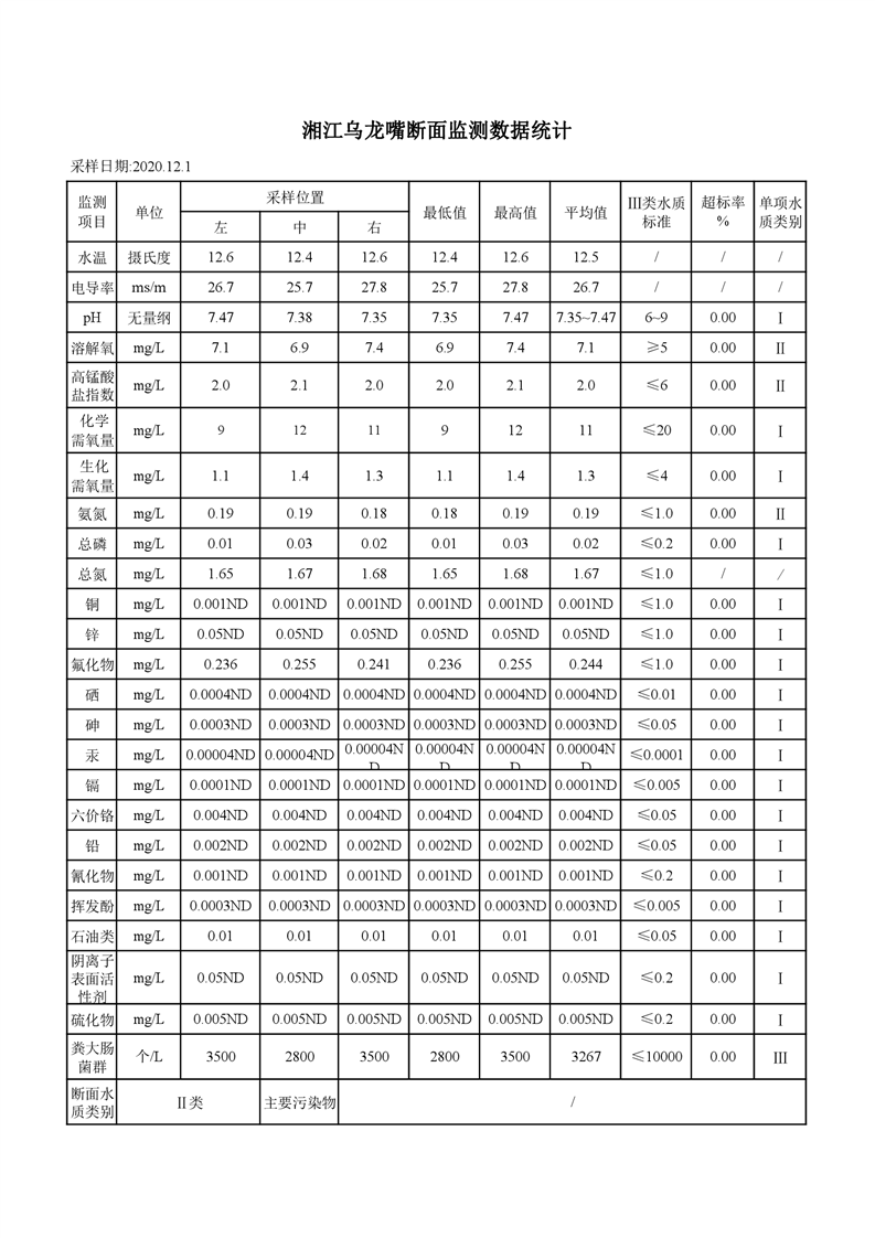 湘江乌龙嘴断面监测数据统计(2020年12月)