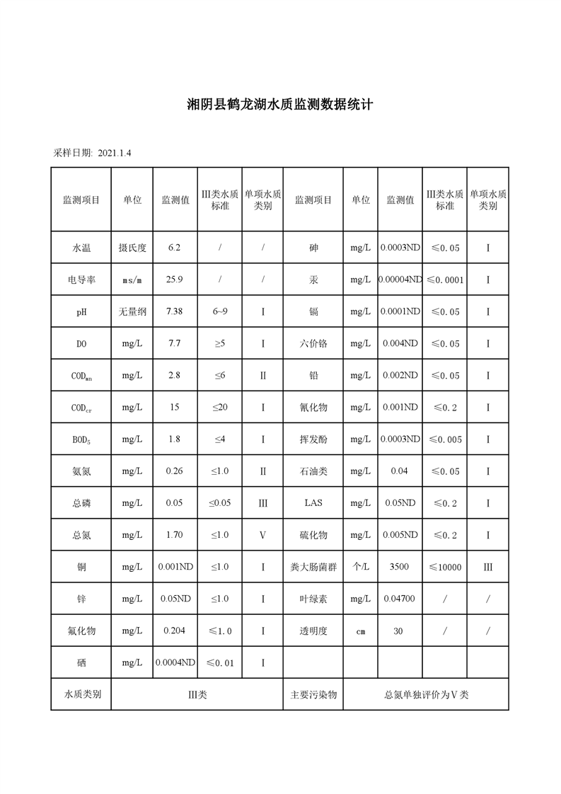 湘阴县鹤龙湖水质监测数据统计(2021年1月)