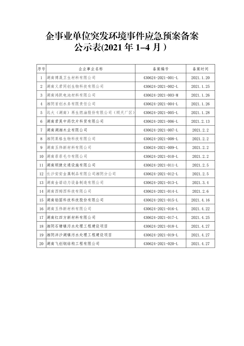 企事业单位突发环境事件应急预案备案 公示表(2021 年 1-4 月)