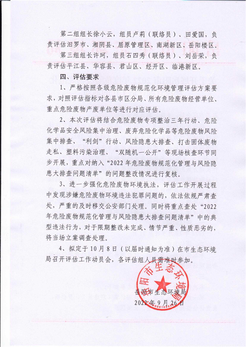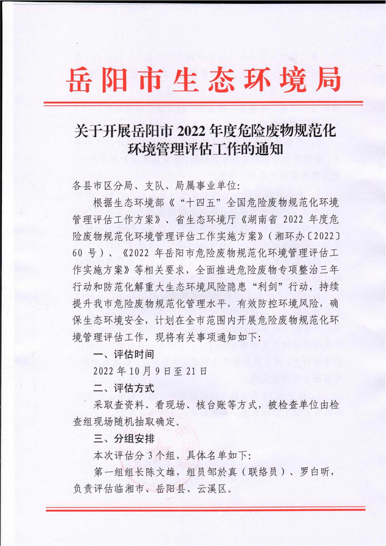 关于开展岳阳市2022年度危险废物规范化环境管理评估工作的通知