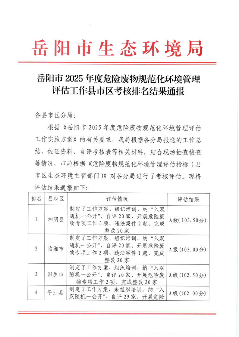 岳阳市2025年度危险废物规范化环境管理评估工作县市区考核排名结果通报