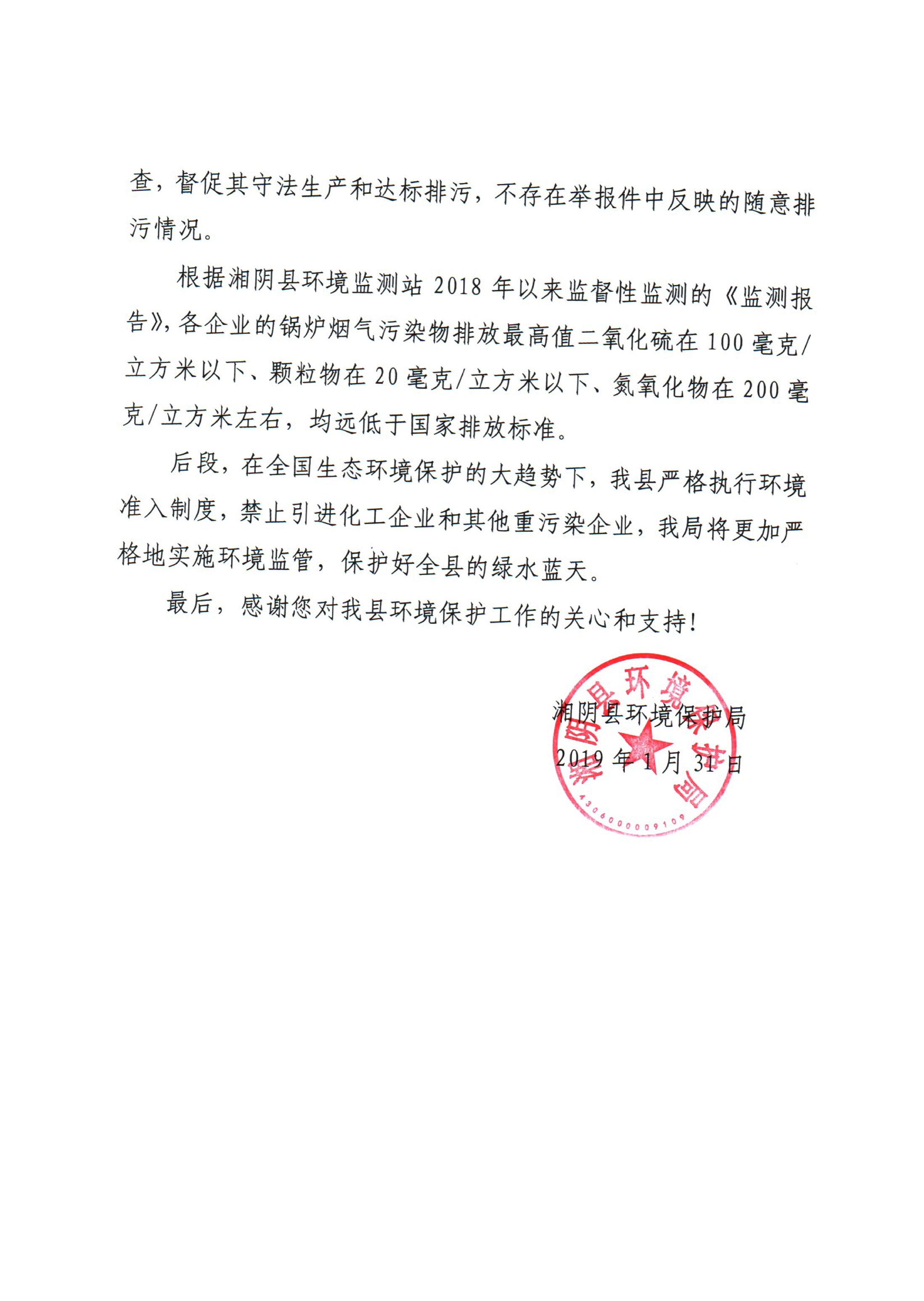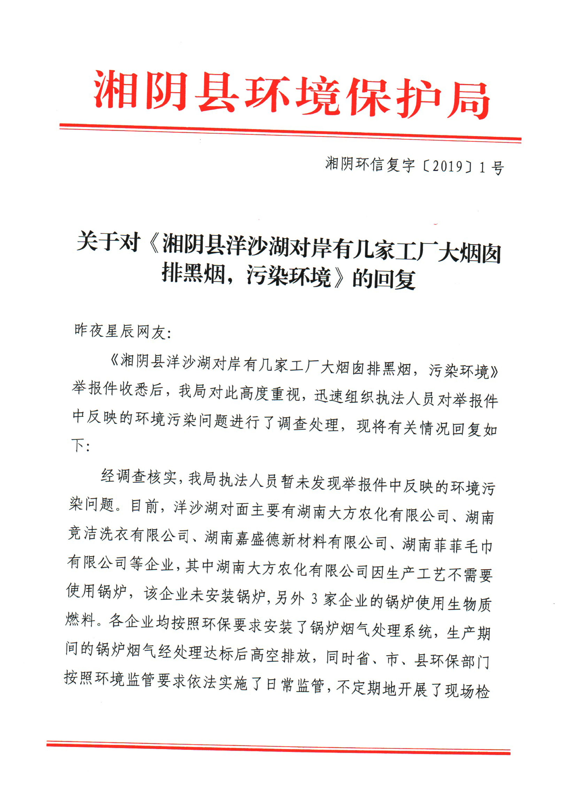 关于对《湘阴县洋沙湖对岸有几家工厂大烟囱排黑烟,污染环境》的回复