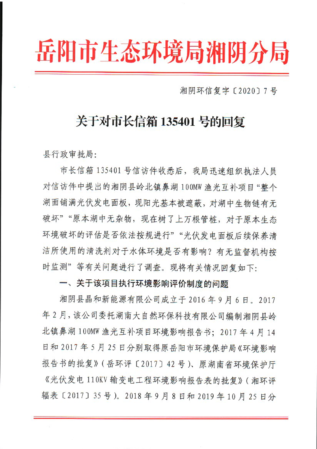 关于对市长信箱135401号的回复