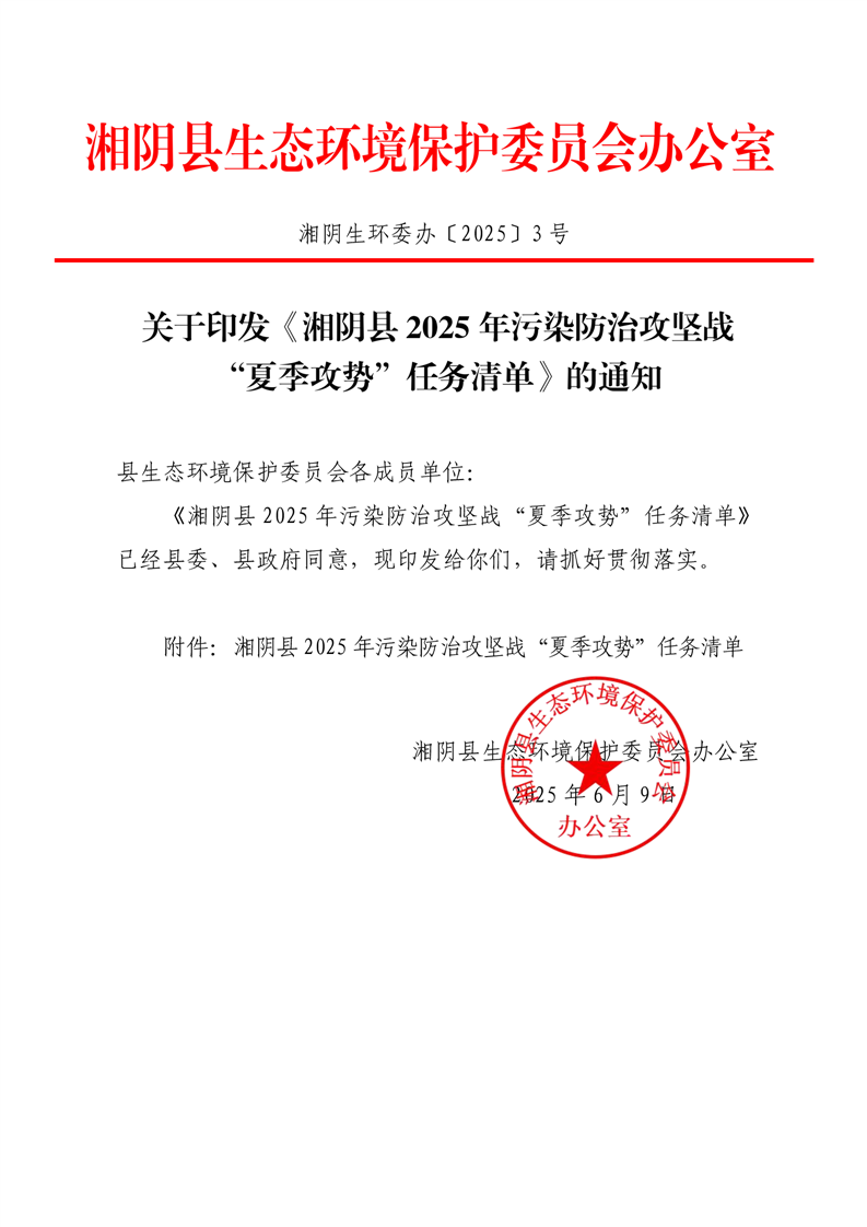 关于印发《湘阴县2025年污染防治攻坚战“夏季攻势”任务清单》的通知