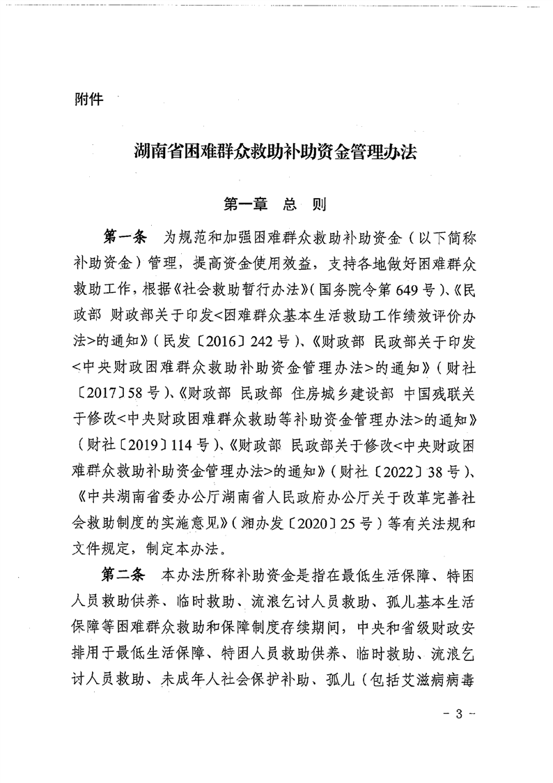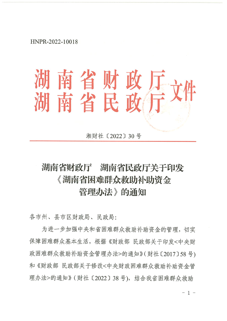 湖南省财政 湖南省民政厅关于印发 《湖南省困难群众救助补助资金 管理办法》的通知 湘财社(2022)30号