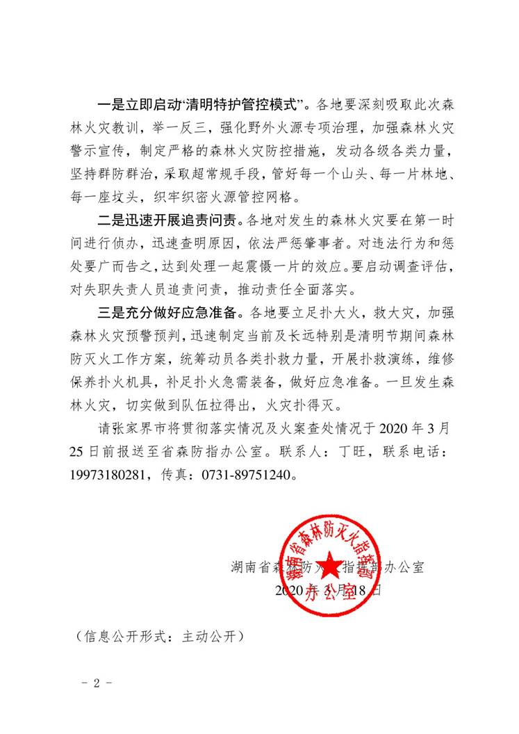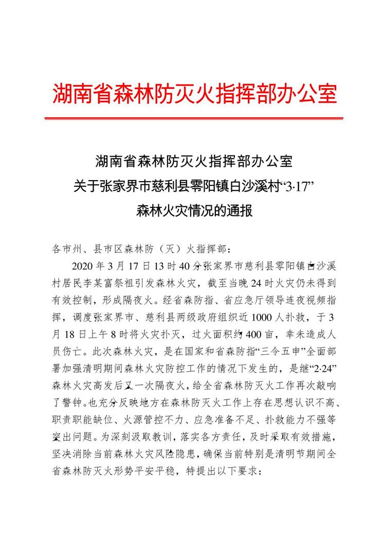 湖南省森林防灭火指挥部办公室关于张家界市慈利县零阳镇白沙溪村“3.17”森林火灾通报的通报