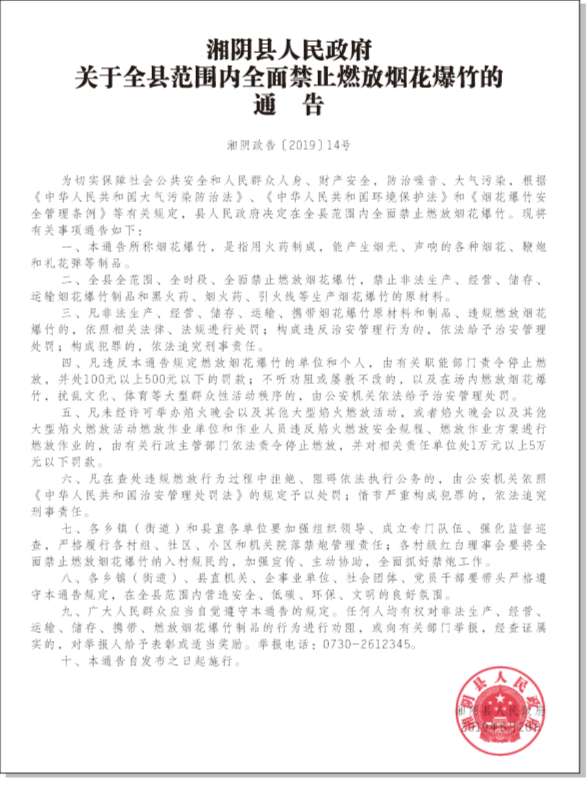 湘阴县人民政府关于全县范围内全面禁止燃放烟花爆竹的通告