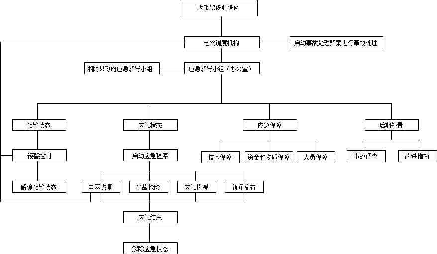 第六条 分层分区。按照分层分区、统一协调、各负其责的原则建立事故应急处理体系。湘阴电力局与所属变电站及供电所按照电网结构和调度管辖范围,制定电网“黑启动”预案,保证电网尽快恢复供电。电力用户根据重要性程度,自备必要的保安措施,避免在突然停电情况下发生灾害。