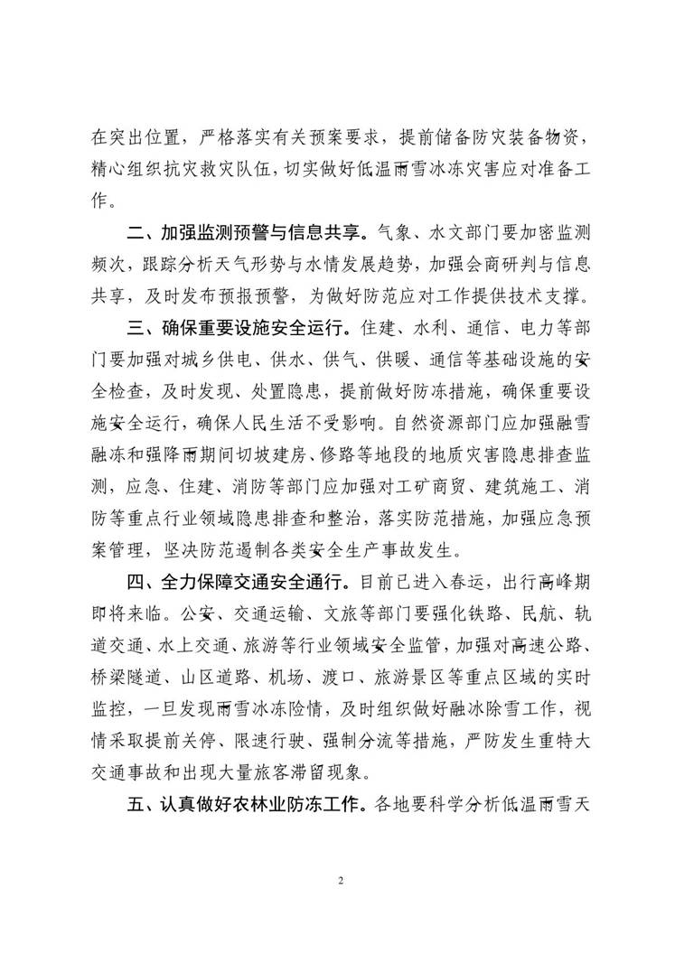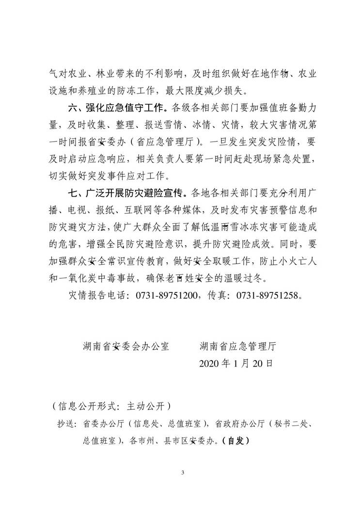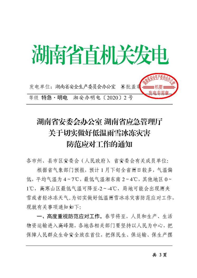 现将湖南省安委会办公室、湖南省应急管理厅《关于切实做好低温雨雪冰冻灾害防范应对工作的通知》(湘安办明电〔2020〕2号)转发给你们,请严格按文件要求抓好落实,严防事故发生。