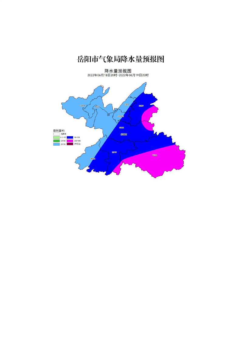根据气象部门最新预报,18 日下午开始,受低涡切变影响,有一轮较强降水天气过程,并伴有雷电、短时强降水等强对流天气,18 至 20 日过程累计雨量 50~80 毫米,局地可达 150 毫米,最大小时雨强 40~70 毫米,最强降水时段为 18 日晚至 19日(具体见岳阳市气象局降雨量预报图)。受降雨影响,平江县全境(特别是平江县东南部)、汨罗市大部(特别是汨罗市南部)、湘阴县东部、岳阳县东部、临湘市南部等地发生山洪灾害的可能性较大,其他地区因局地短历时强降水也可能引发山洪灾害。请各县市区加强防范,全方位、多渠道做好防范本次强降雨的宣传工作,及时通过村村响、电视、广播等途径发布预警信息;强降雨期间,各山洪灾害危险区的责任人、预警员、信息员要到岗履职,坚持 24 小时巡查值守;进一步明确转移信号和转移路线,提请当地防汛抗旱指挥部做好人员转移准备工作,该转移时必须迅速组织转移确,确保人民群众生命安全。