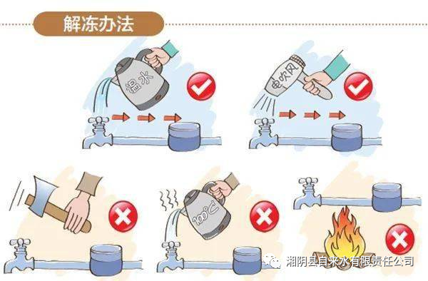 如水表、水龙头、水管出现结冰现象,宜先用热毛巾包裹水龙头,浇温水,使水龙头解冻。随后打开水龙头,用温水沿水龙头慢慢向管子浇洒,使水管解冻。若浇水表处仍不见水流,则水表被冻住了。此时,再用热毛巾包在水表上,用温水(不超过60摄氏度)浇淋,切勿浇沸水、用明火烘烤,以防水管、水表及水表玻璃爆裂。如不具备用温水浇淋的条件,也可采用电吹风烘吹。