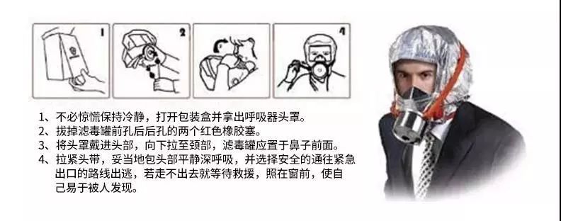 学会使用防毒面具。宾馆酒店中一般会放置防毒面具,找到他们的位置,包装上会有使用图示,学习使用,关键时刻有大用。