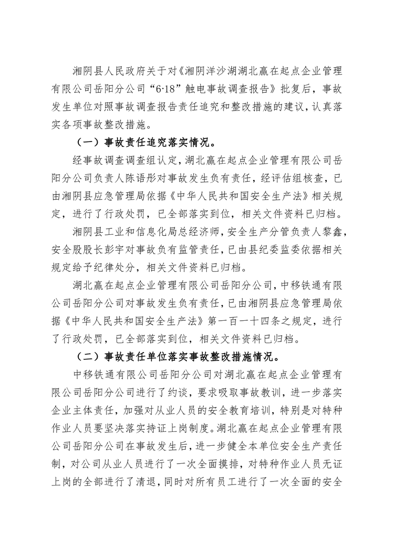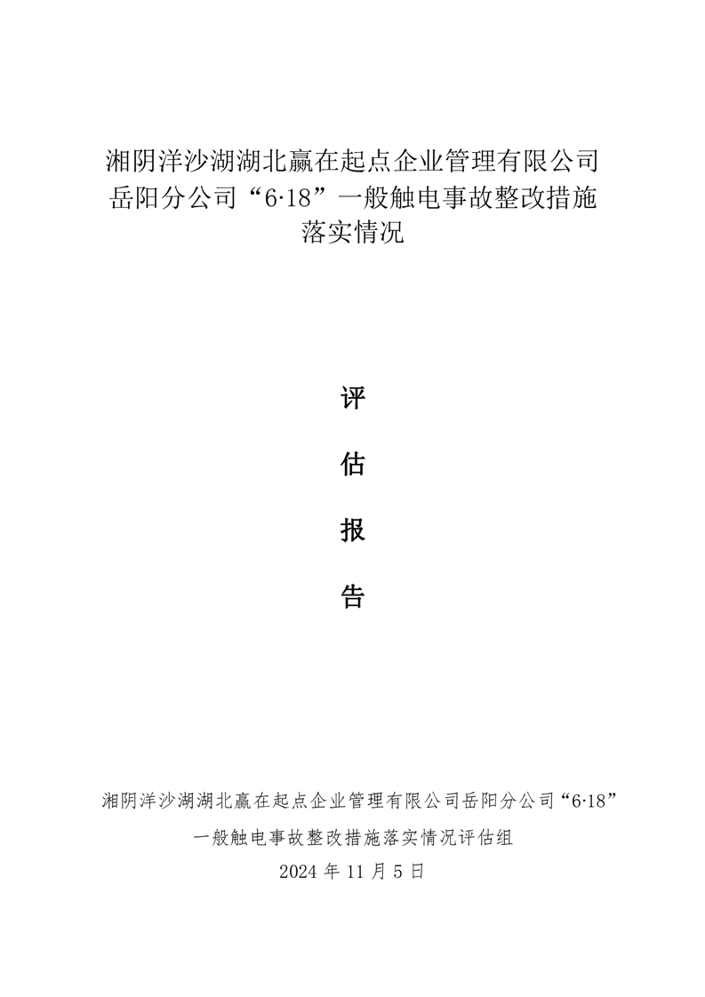 湘阴洋沙湖湖北赢在起点企业管理有限公司岳阳分公司“6.18”一般触电事故整改措施落实情况评估报告