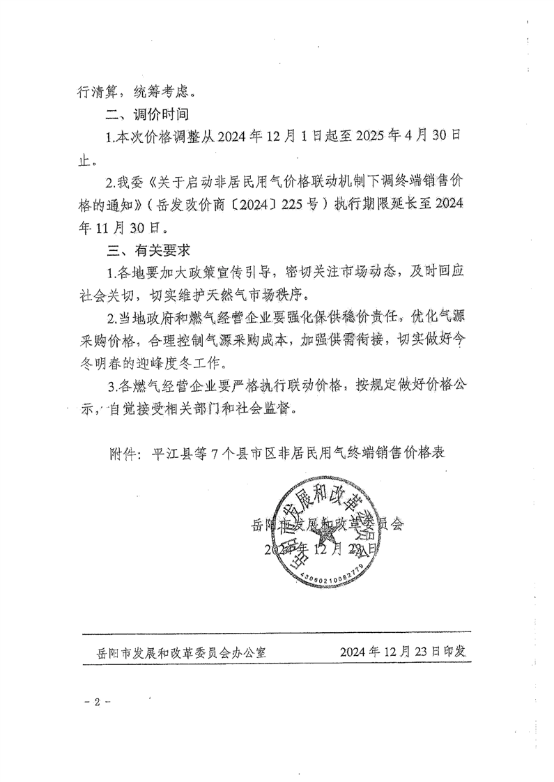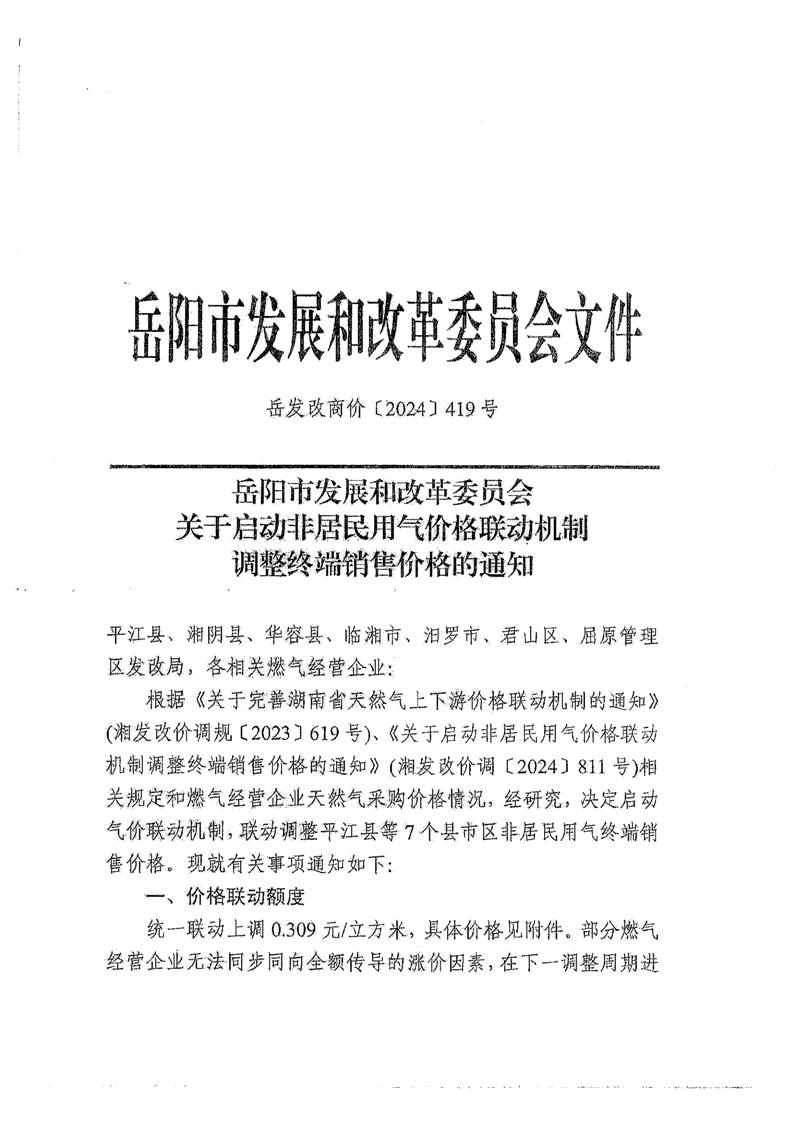 岳阳市发展和改革委员会 《关于启动非居民用气价格联动机制调整终端销售价格的通知》 岳发改商价〔2024〕419号 》