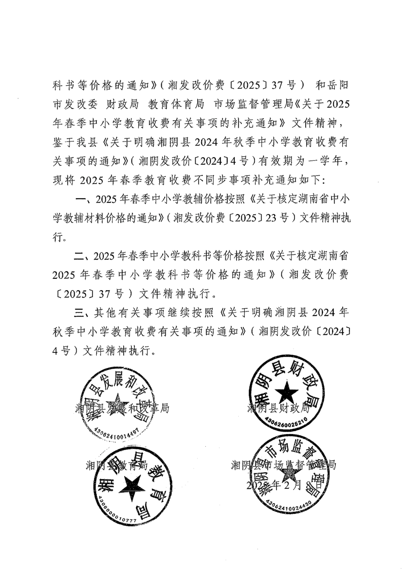 湘阴县发展和改革局 湘阴县财政局 湘阴县教育局 湘阴县市场监督管理局 湘阴发改价〔2025〕3号 关于2025年春季中小学教育收费有关事项的补充通知
