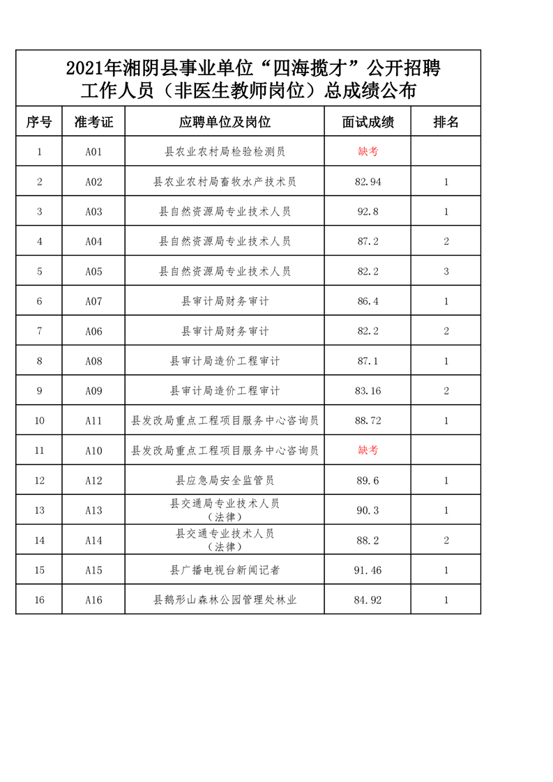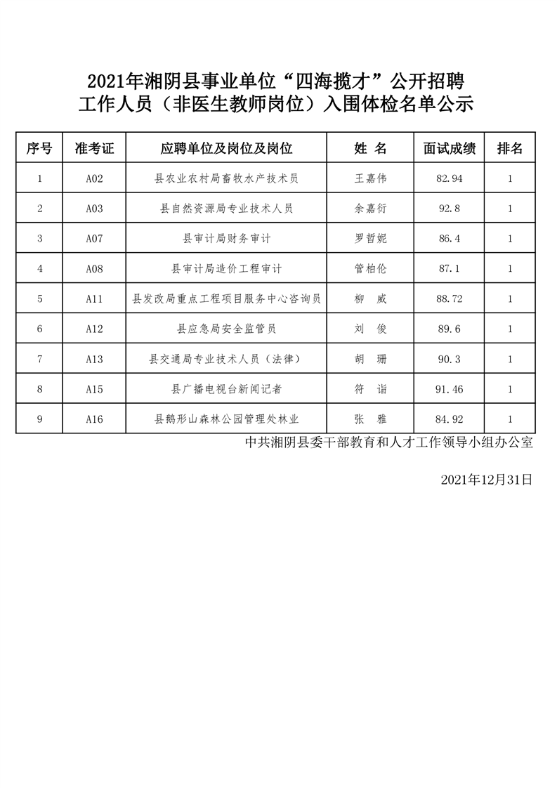 2021年湘阴县事业单位“四海揽才”公开招聘工作人员(非医生教师岗位)总成绩及入围体检名单公布