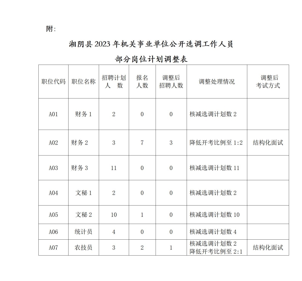关于调整湘阴县2023年机关事业单位公开选调工作人员 部分岗位开考比例、计划数及考试方式的公告