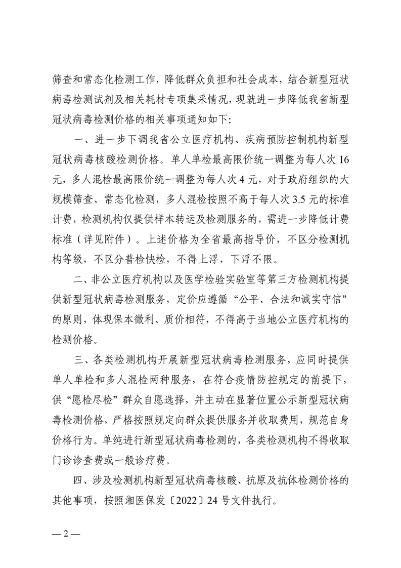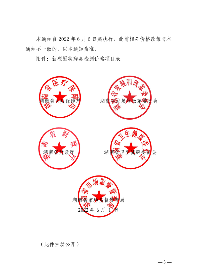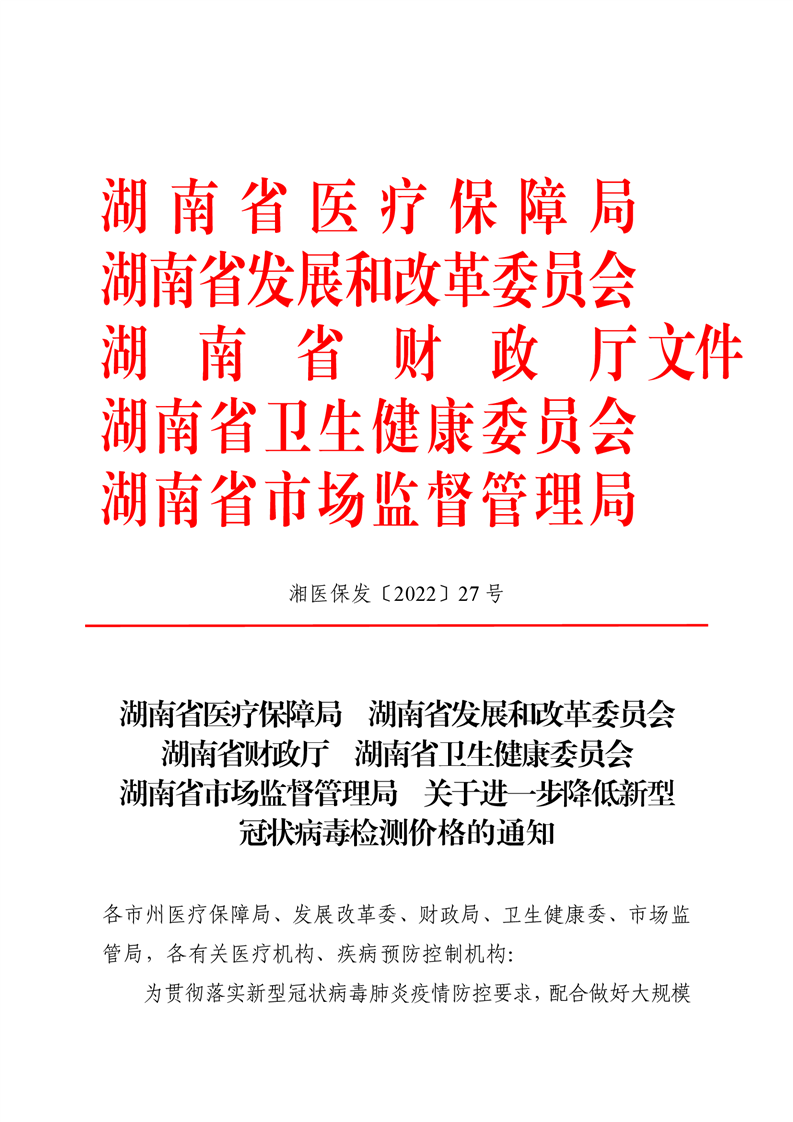 湖南省医疗保障局 湖南省发展和改革委员会 湖南省财政厅 湖南省卫生健康委员会 湖南省市场监督管理局 关于进一步降低新型 冠状病毒检测价格的通知