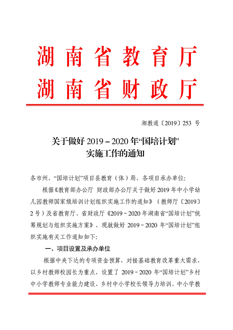 湖南省财政厅关于做好2019-2020年“国培计划”实施工作的通知