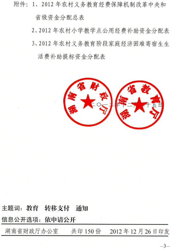 湖南省财政厅 湖南省教育厅关于下达2012年农村义务教育经费保障机制改革中央和省级资金的通知