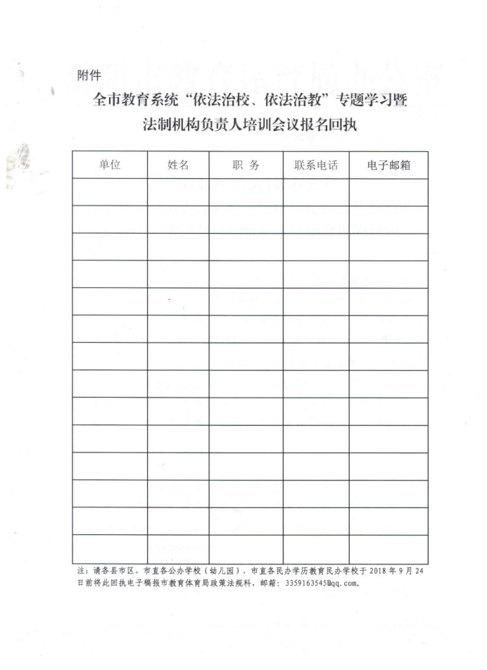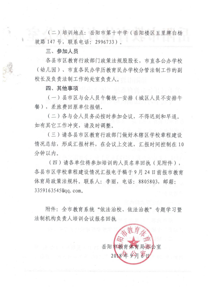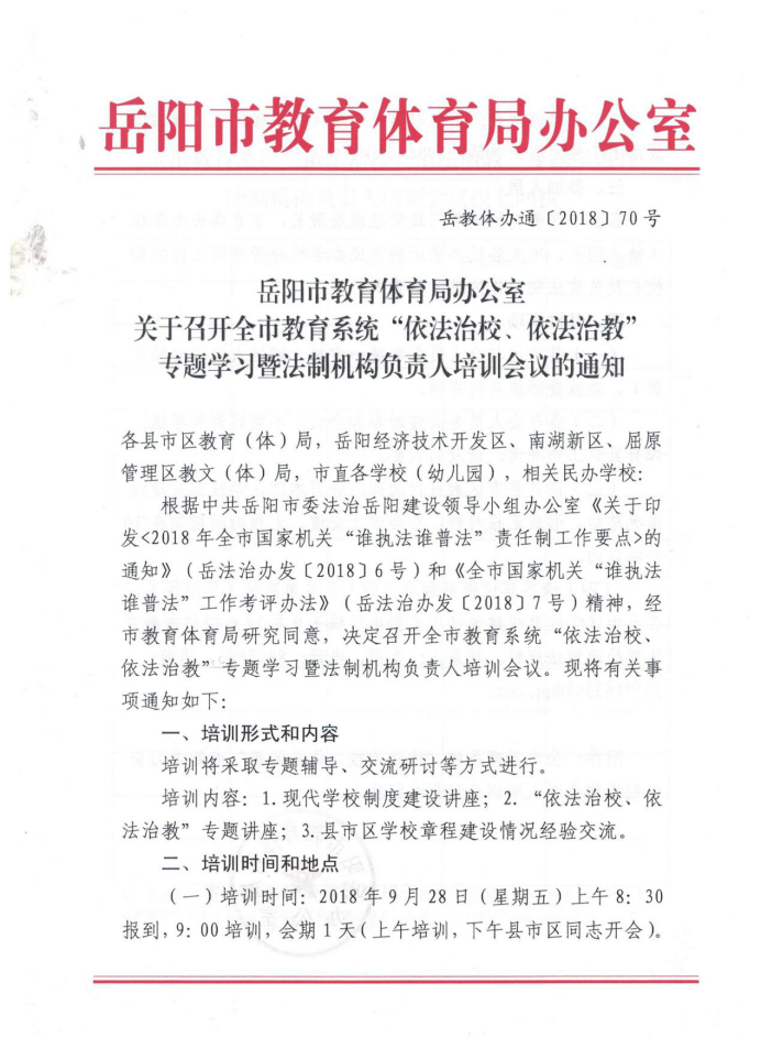 岳阳市教育体育局办公室关于召开全市教育系统“依法治校、依法治教”专题学习暨法制机构负责人培训会议的通知(岳教体办通[2018]70号)