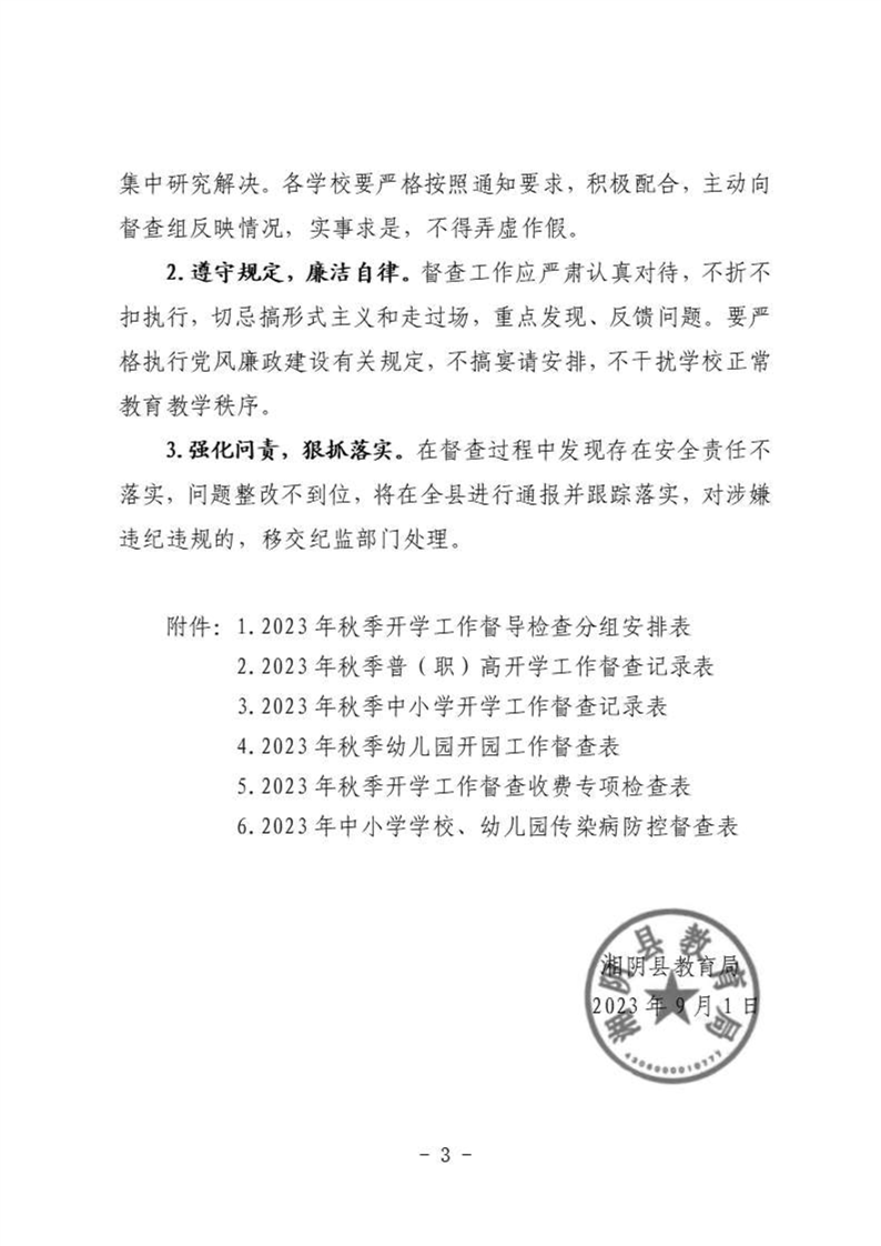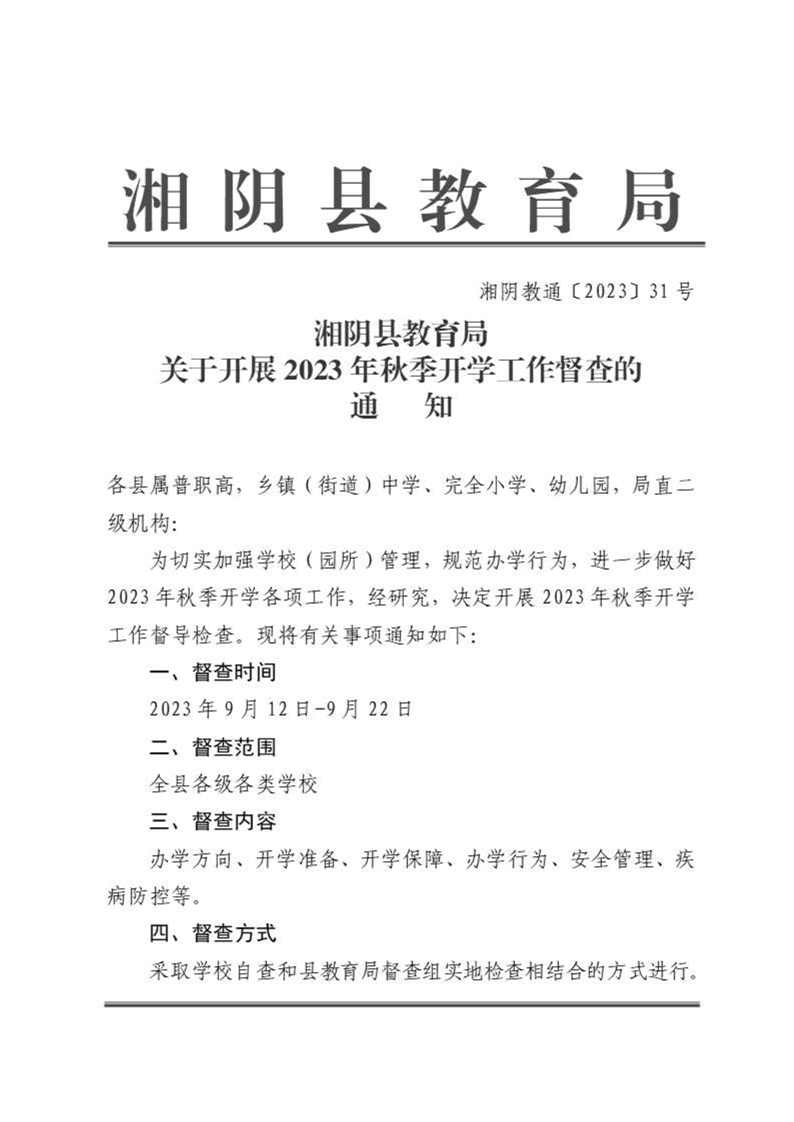 湘阴教通〔2023〕31号关于开展2023年秋季开学工作督查的通知