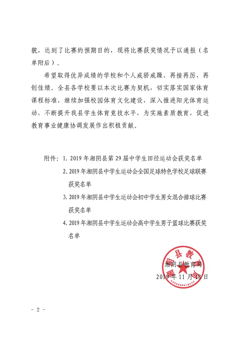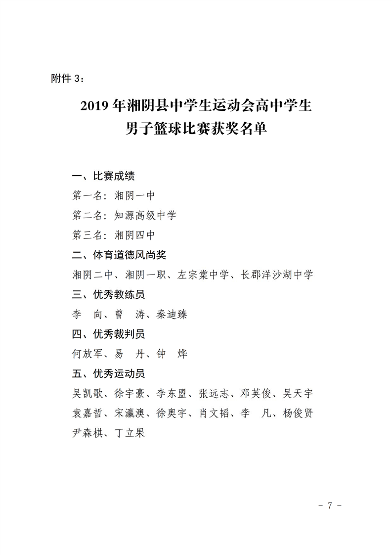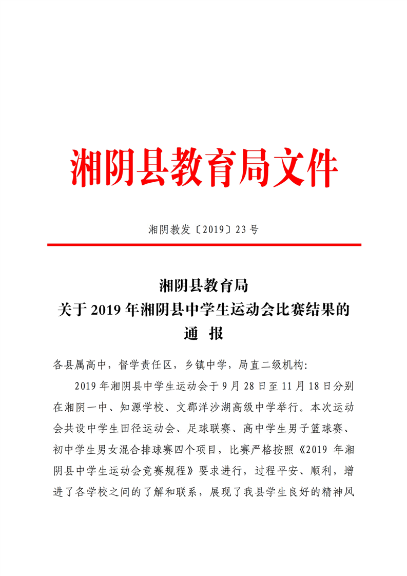 2019年湘阴县中学生运动会比赛结果