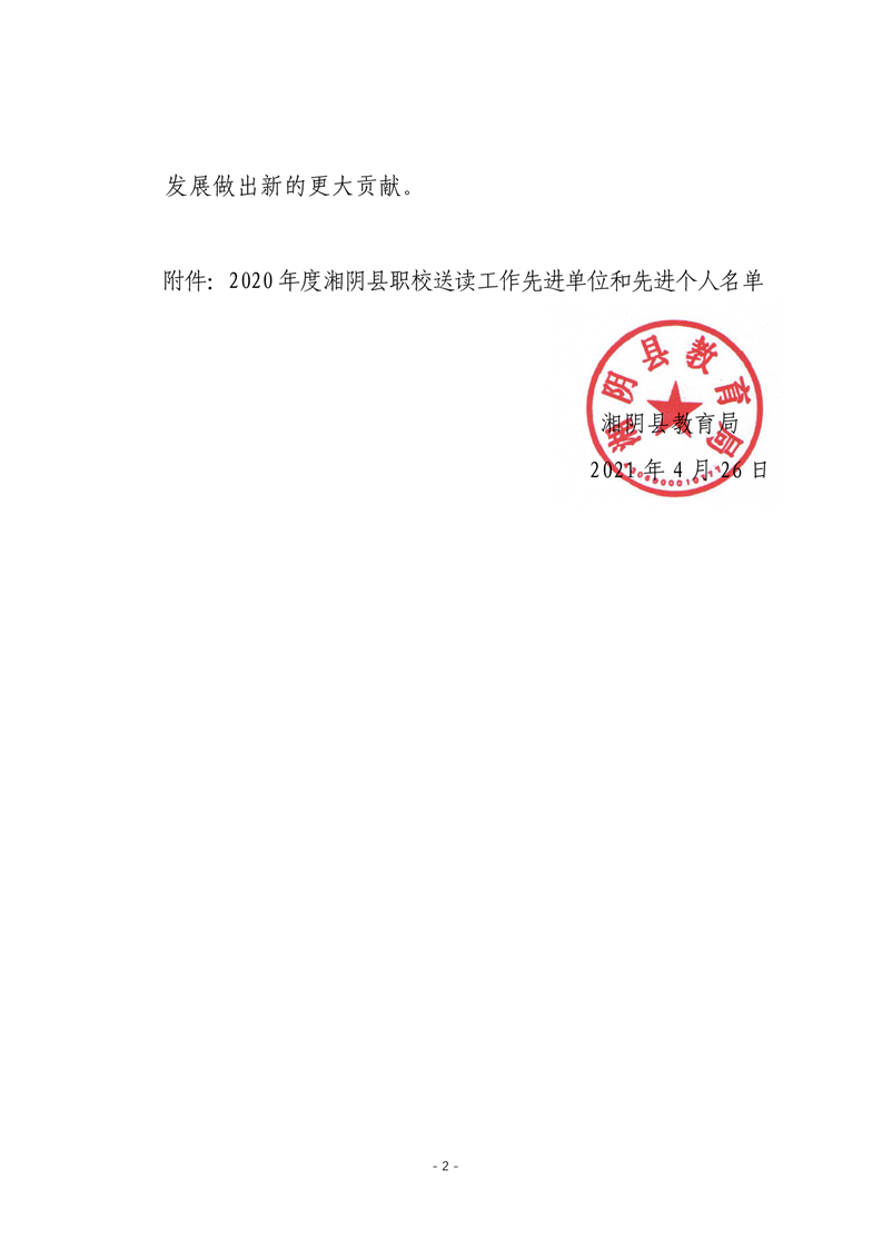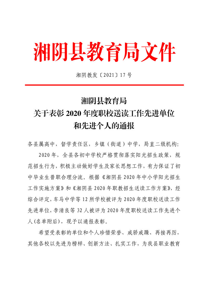 湘阴教发〔2021〕17号湘阴县教育局关于表彰2020年度职校送读工作先进单位和先进个人的通报
