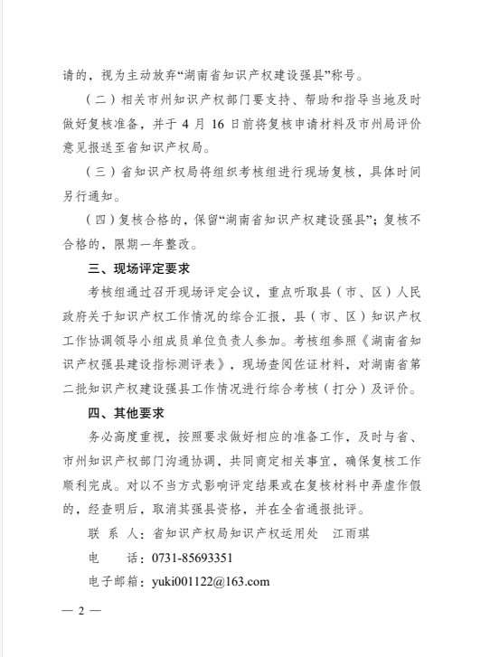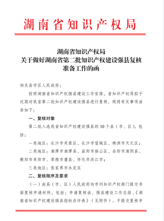湖南省知识产权局关于做好湖南省第二批知识产权建设强县复核准备工作的函